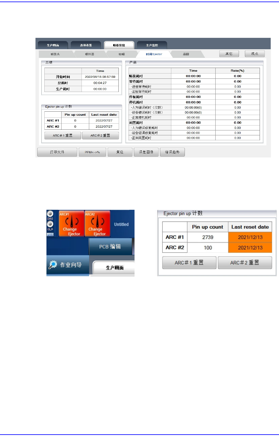 您可以查看喷射器顶针的上升次数和最新的初始化信息。