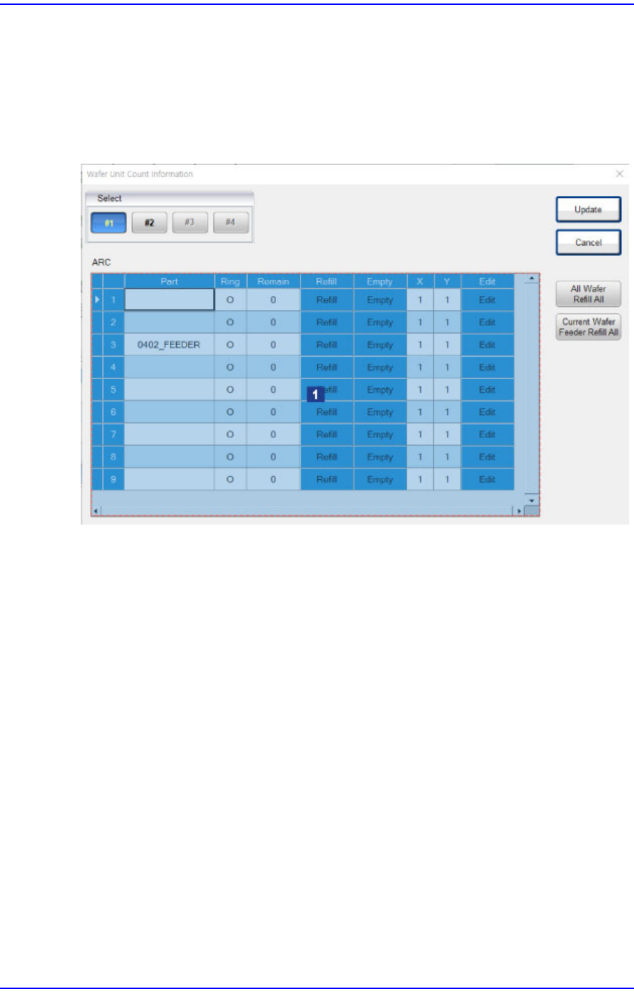 8-36 Cutting-edge Modular Mounter HM Series A dministrator's Guide <Refill> 列 取出用尽的晶圆环并放入有元件 的晶圆环后, 触摸此按钮将拾取位置重置为 第一个元件位置 ( X = 1 , Y = 1 )。 <Empty> 列 选择此处将更改为晶圆上没有剩 余元件的状态。 <Edit> 列 <Ed…