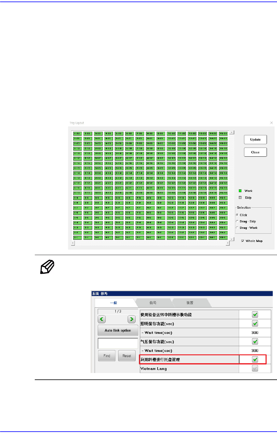 单中设置“利用料槽进行托盘管理”复选框。