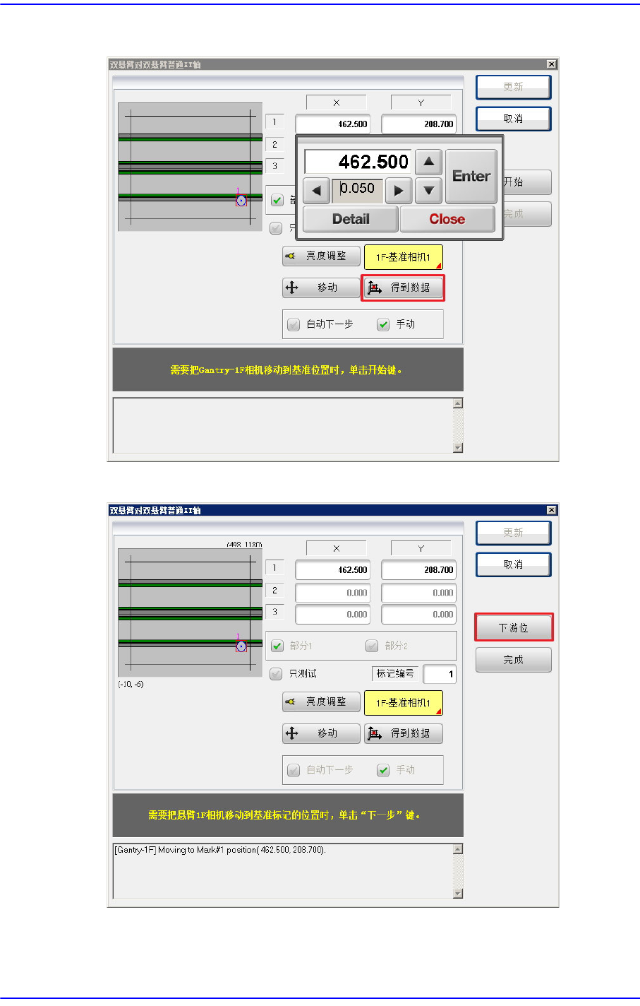 选择此校验框后单击<下个> 按钮自动执行各Gantry间坐标系一致化的过程。
