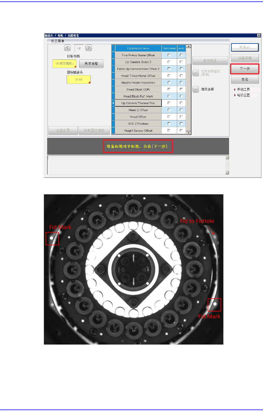 12-96 Cutting-edge Modular Mounter HM Series A dministrator's Guide 2. 在信息框上出现 “Calibration is Prepared.T o Calibrate, Click [Next].” 的提示 内容时 按下 < 下一步 > 按钮。 3. 贴装头模组朝固定相机移动并 自动进行校准 (Calibration) 。