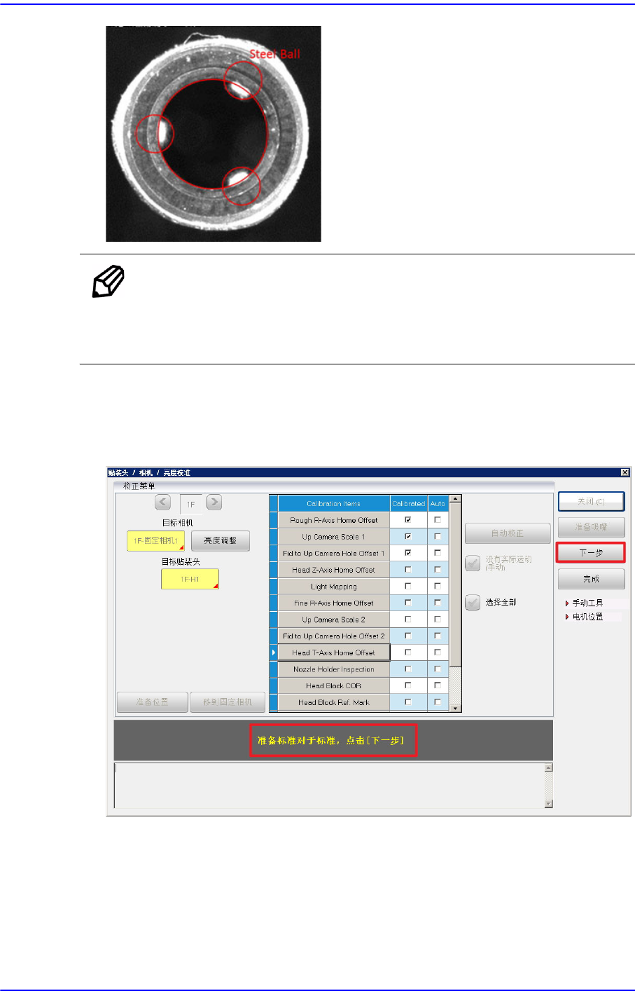 12-99 校正 2. 按下 <Head T -Axis Home Offset> 按钮。 3. 若出现下列消 息, 按下 < 下一步 > 按钮。 按下 < 下一步 > 按钮, 就会识别喷嘴座, 并安装 ANC 的 Calibration 喷嘴。 喷嘴座 识别失败时, 检查 Holder 清 洁或照明状态后再执行 Calibration 。