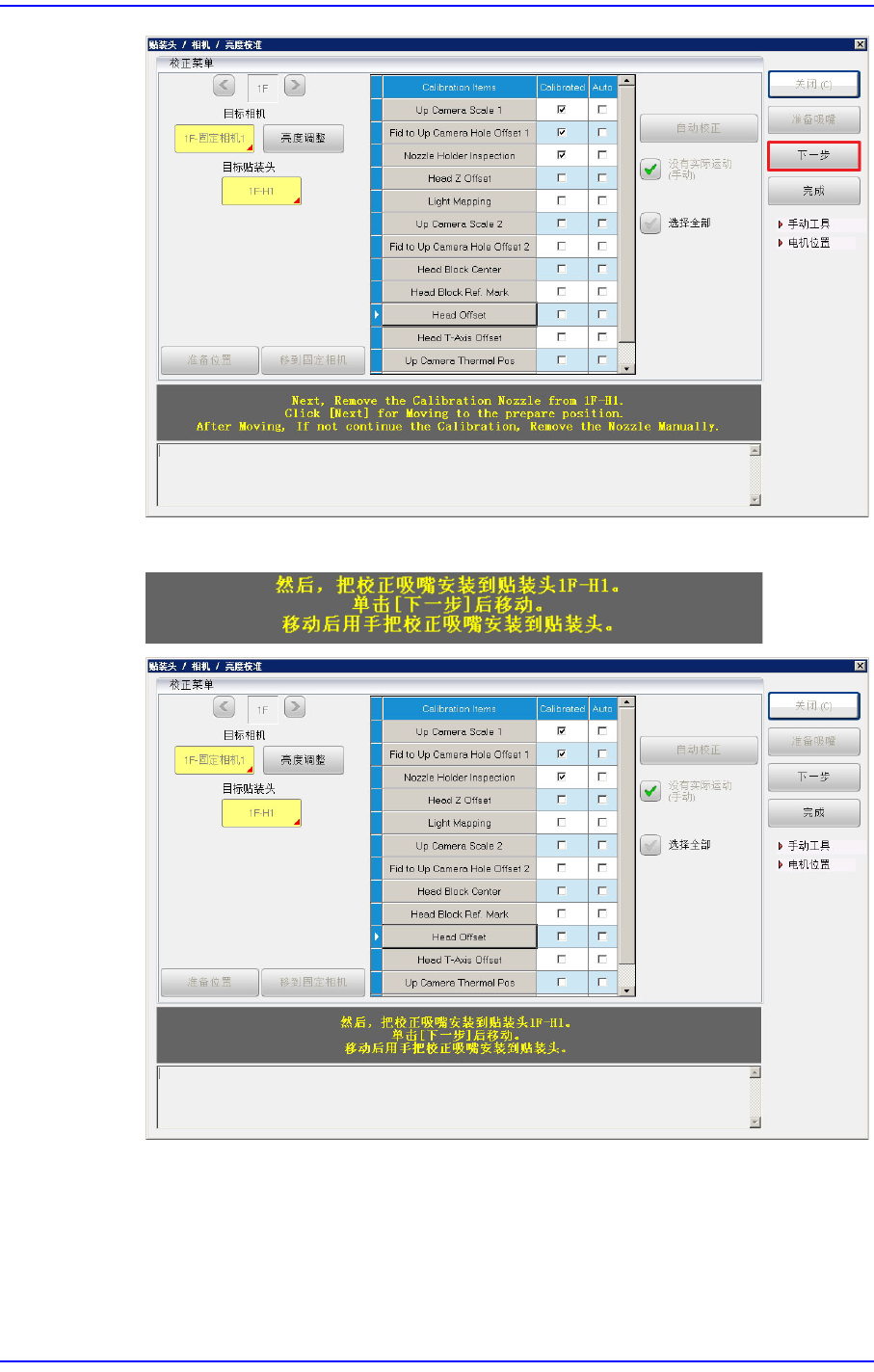 5. 按下<下一步>键时,贴装头模组朝固定相机移动并自动进行校准(Calibration)。