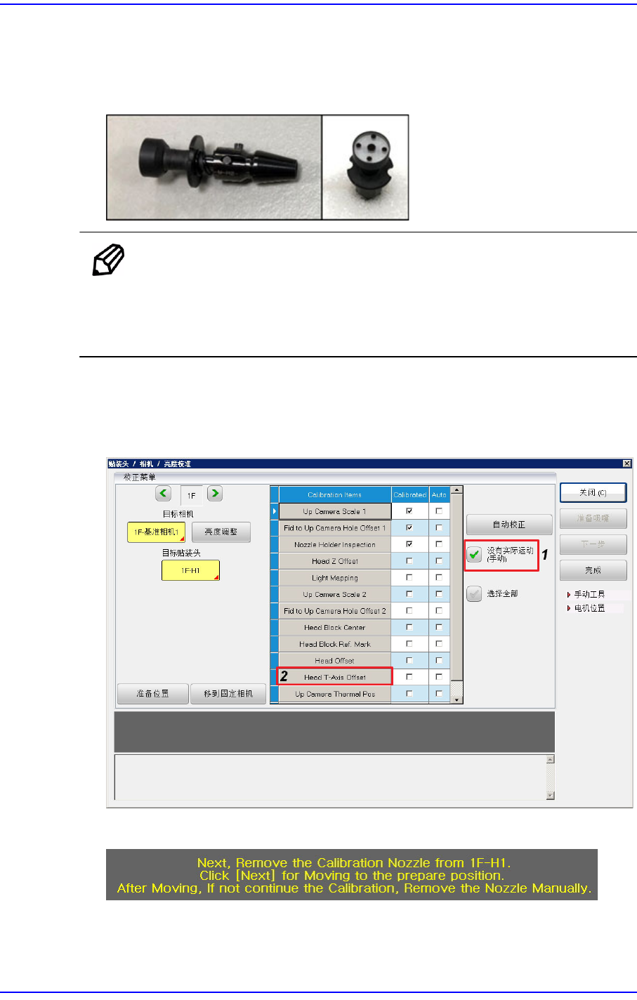 1. 选择<没有实际运动 (手动)>复选框后,按下<Head T-Axis Offset Calibration>按