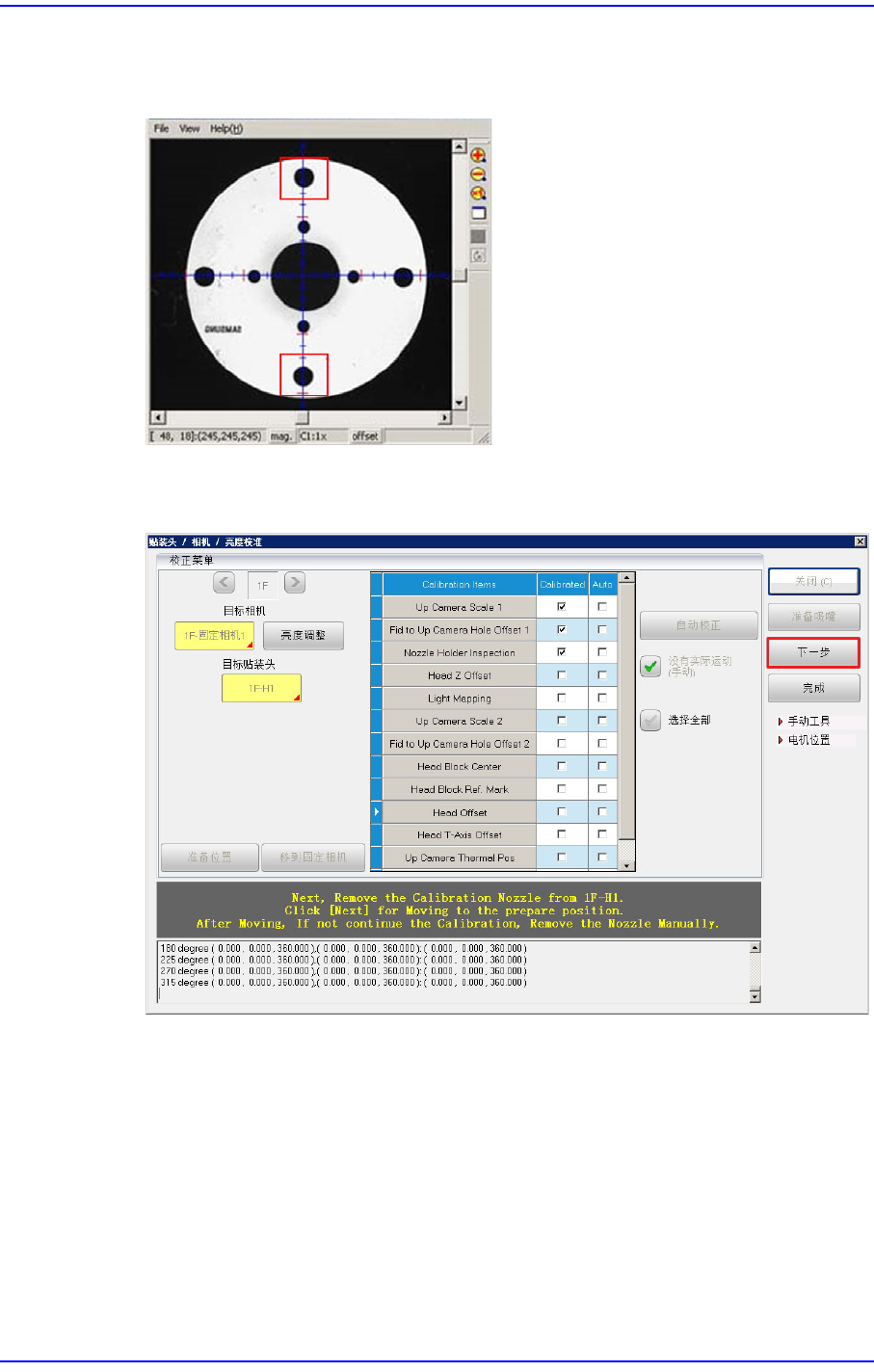 5. 按下<下一步>键时,贴装头模组朝固定相机移动并自动进行校准(Calibration)。