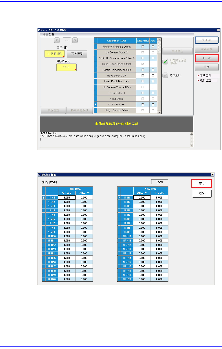 7. 全部贴装头的校准完毕后,将如下出现结果窗。按下<更新>键就能适用临时保