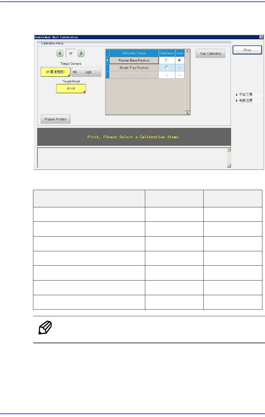 12-138 Cutting-edge Modular Mounter HM Series A dministrator's Guide 12.1.11. 个别单位校准 能够实行的校准项会随着适用于设 备的选项及安装的装置而不同。 各个单元的校准项目如下。 备注 与 “ 晶圆装置 ” 相关的功能仅适用 于 HM520h 。 Calibration High Speed Multi Functional Feeder Base …