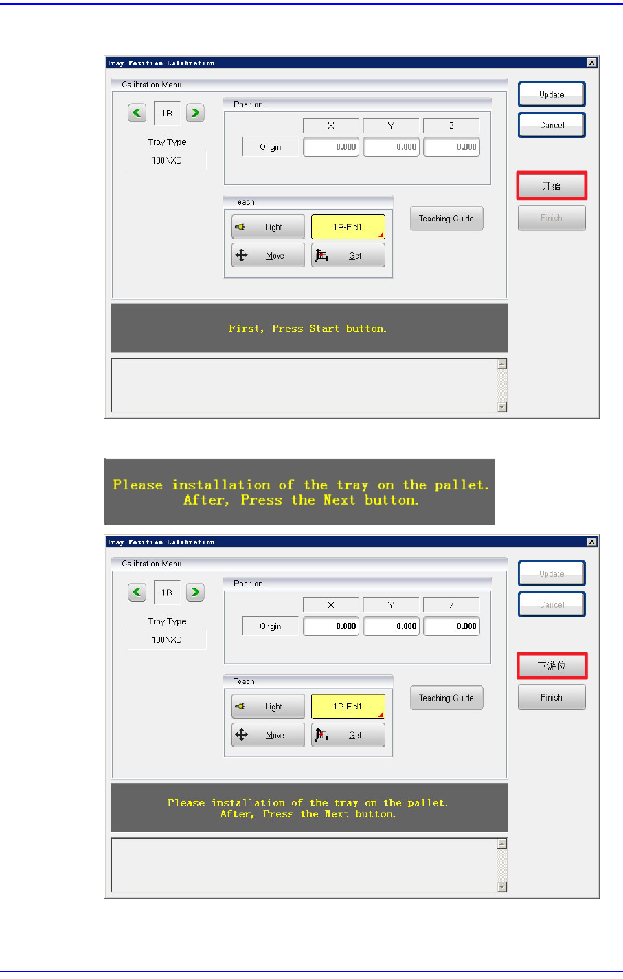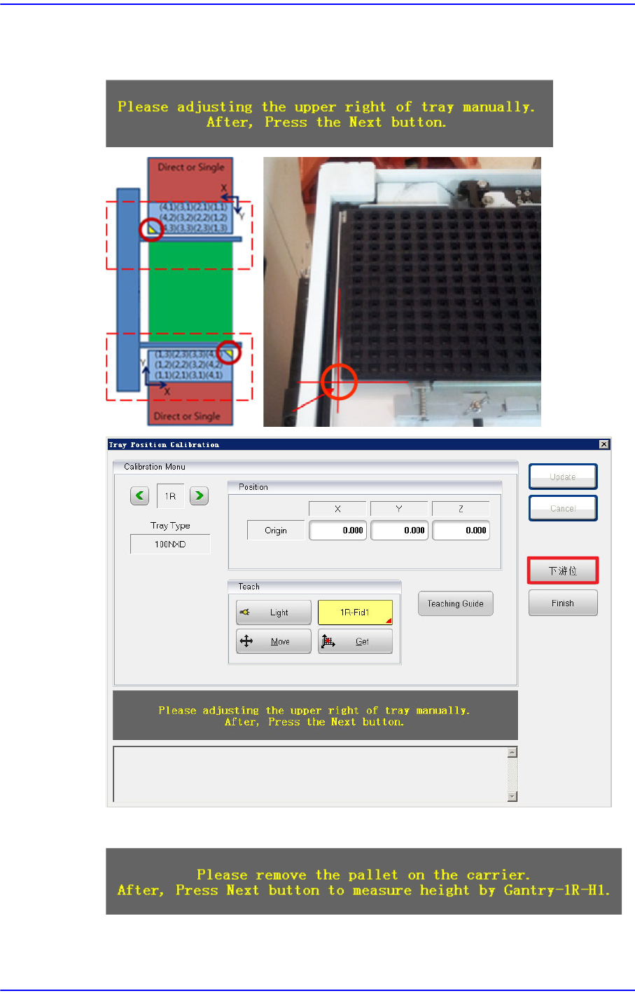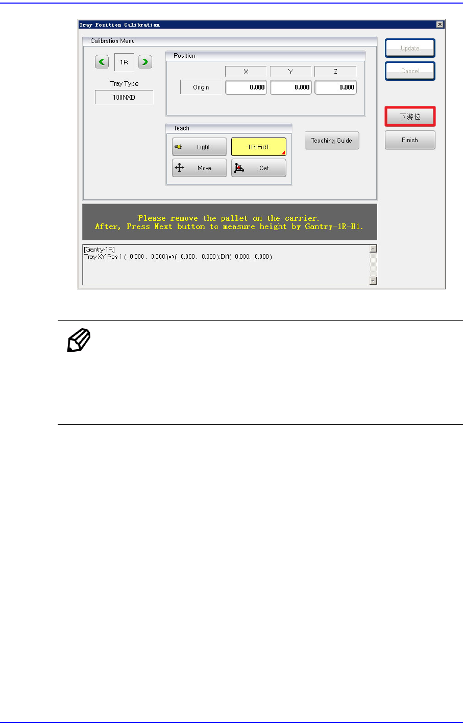 3. 若出现下列消息,在Pallet上安装Tray 后按下<下一步> 按钮。
