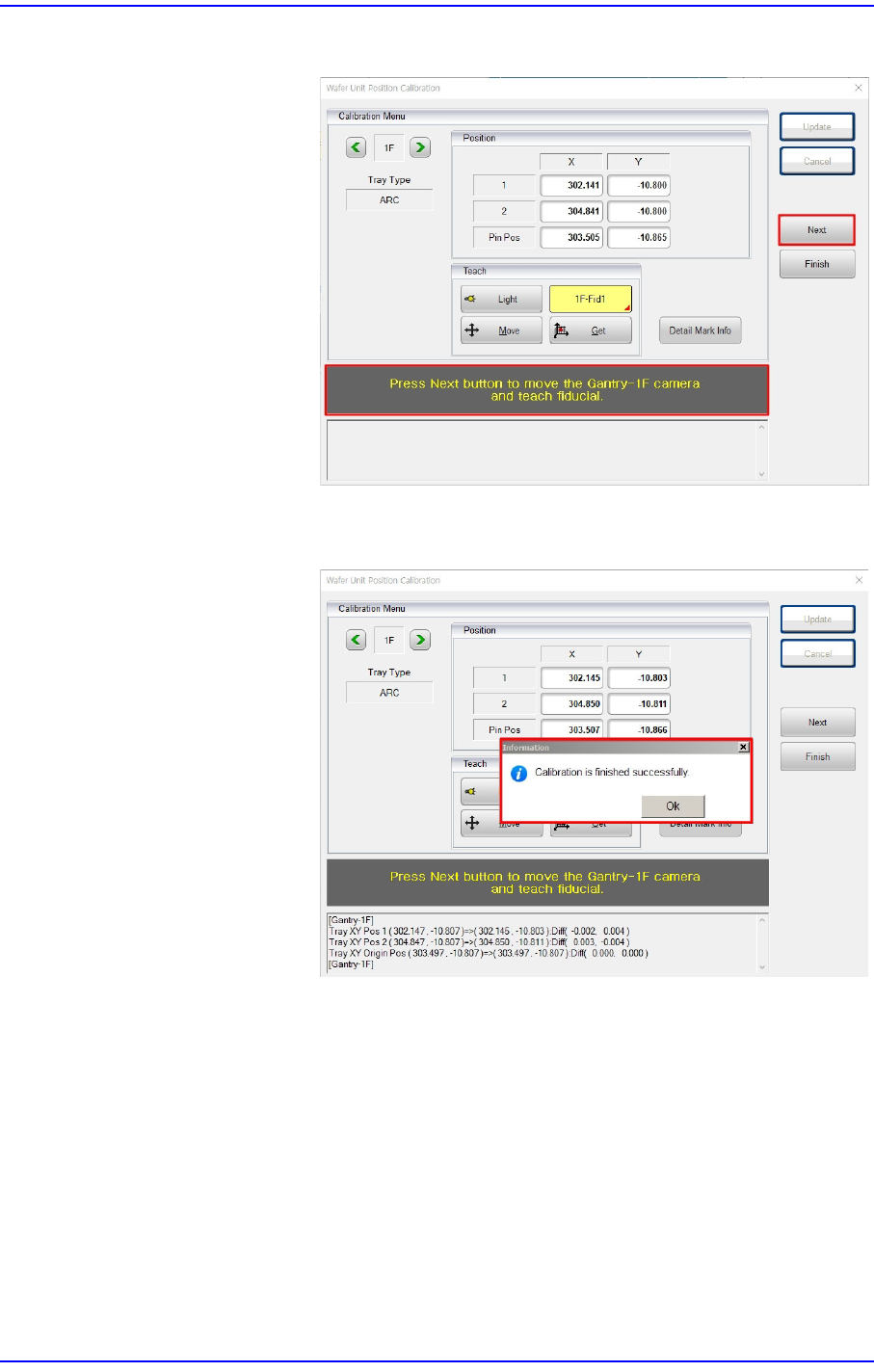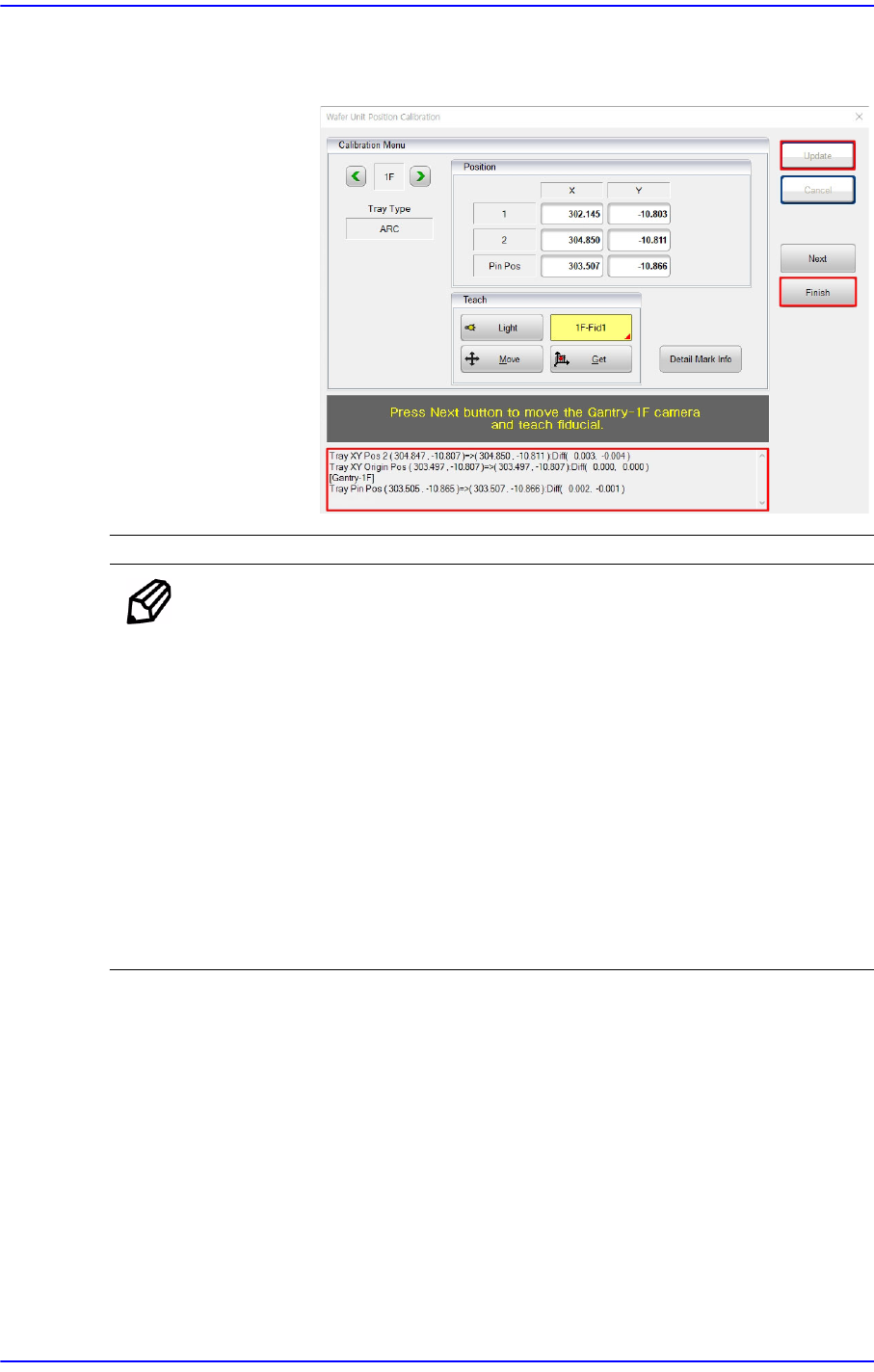 12-154 Cutting-edge Modular Mounter HM Series A dministrator's Guide 5. 查看下方的 校准结果, 然后依次点击 < 完成 > 按钮和 < 更新 > 按钮, 将校准结果适用于系统。 备注 如果无法识别顶出模块和顶 针的原点, 请参考以下步骤, 更改标 记信息 (形状和位置) , 重新进行校正, 然后重试该步骤。 选择 “ 详细标记信…