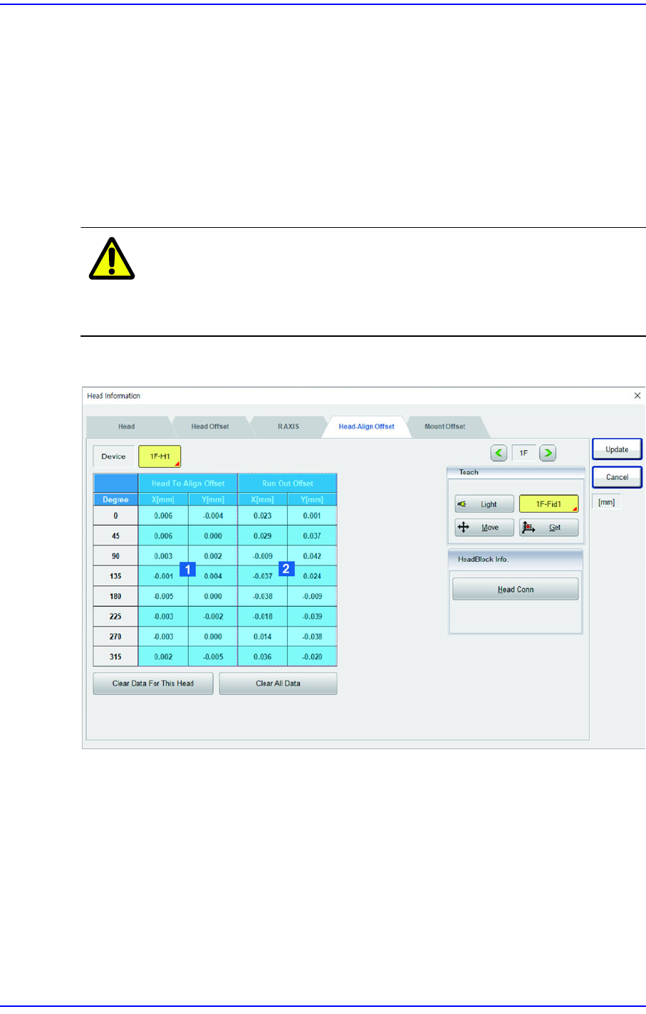 12-186 Cutting-edge Modular Mounter HM Series A dministrator's Guide < 清 除所有数据 > 按钮 所有贴装头的贴装头补正补偿 (Offset) 进行初 始化。 < 示教 > 区域 用于检查偏移位置或示教。 用于将基准摄像机移动到指定 的坐标位置, 或者获取当前坐标。 < 头 块的信息 > 区域 < 连…