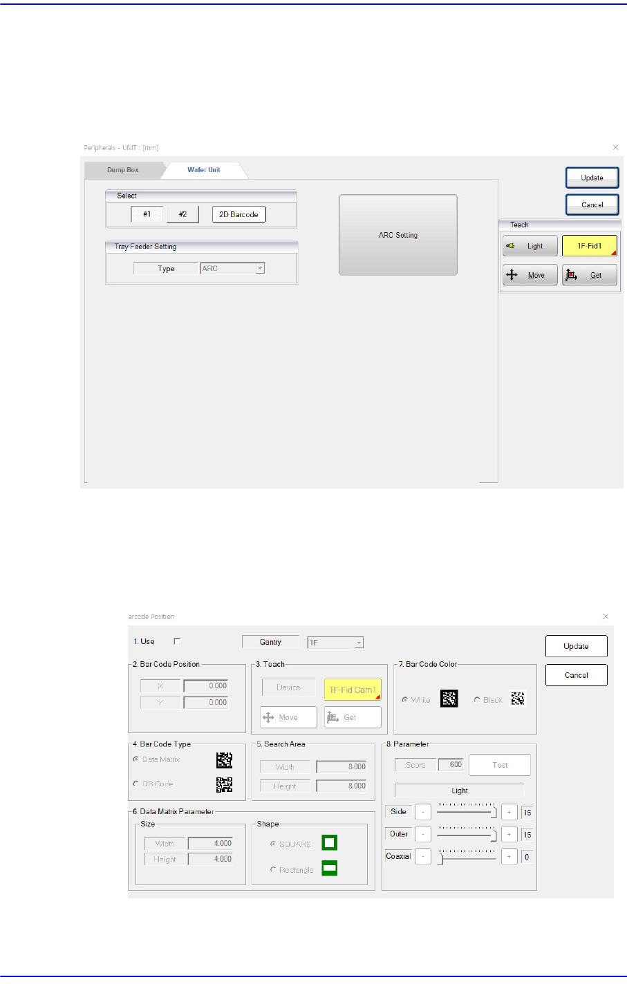 13-21 系统设置 <1. 使用 > 复选框 选择是否使用 2D 条形码功 能。 在 <2. 条形码 位置 > 编辑框 设置 2D 条形码在晶 圆上的位置。 仅在 <3. 位置测量 > 区域 用于校正 2D 条形码在晶圆上的位置。 <4. 条形码类型 > 选项按 钮 设置二维码的类型。 <5. 搜索区域 > 编辑框 在相机获取的图像中设置检查 2D 条形 …