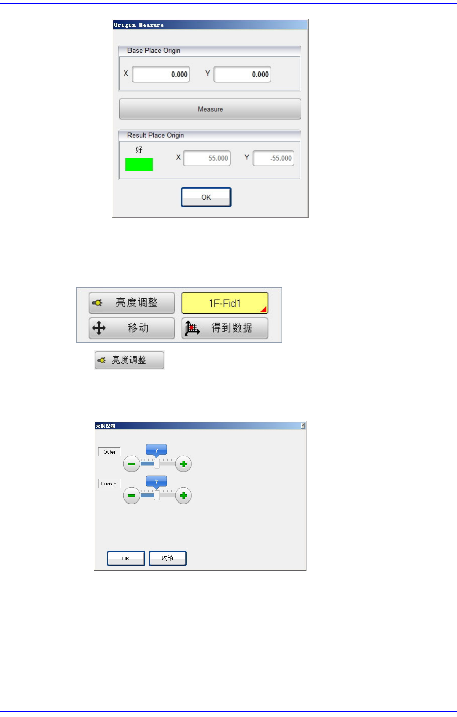 2-9 板的定义 示教 可以示教贴装原点。 把基准摄像机移动到指定的坐标位 置, 或者获取当前坐标。 按钮 设置基准摄像机的照明。 把照明调整到最 适合示教贴装原点的亮度。 按下此按钮时, 显示以下画面。 Selection control 可以选择示教贴装原点 (Place Origin) 时使用的对象。 可选择的对象如下。