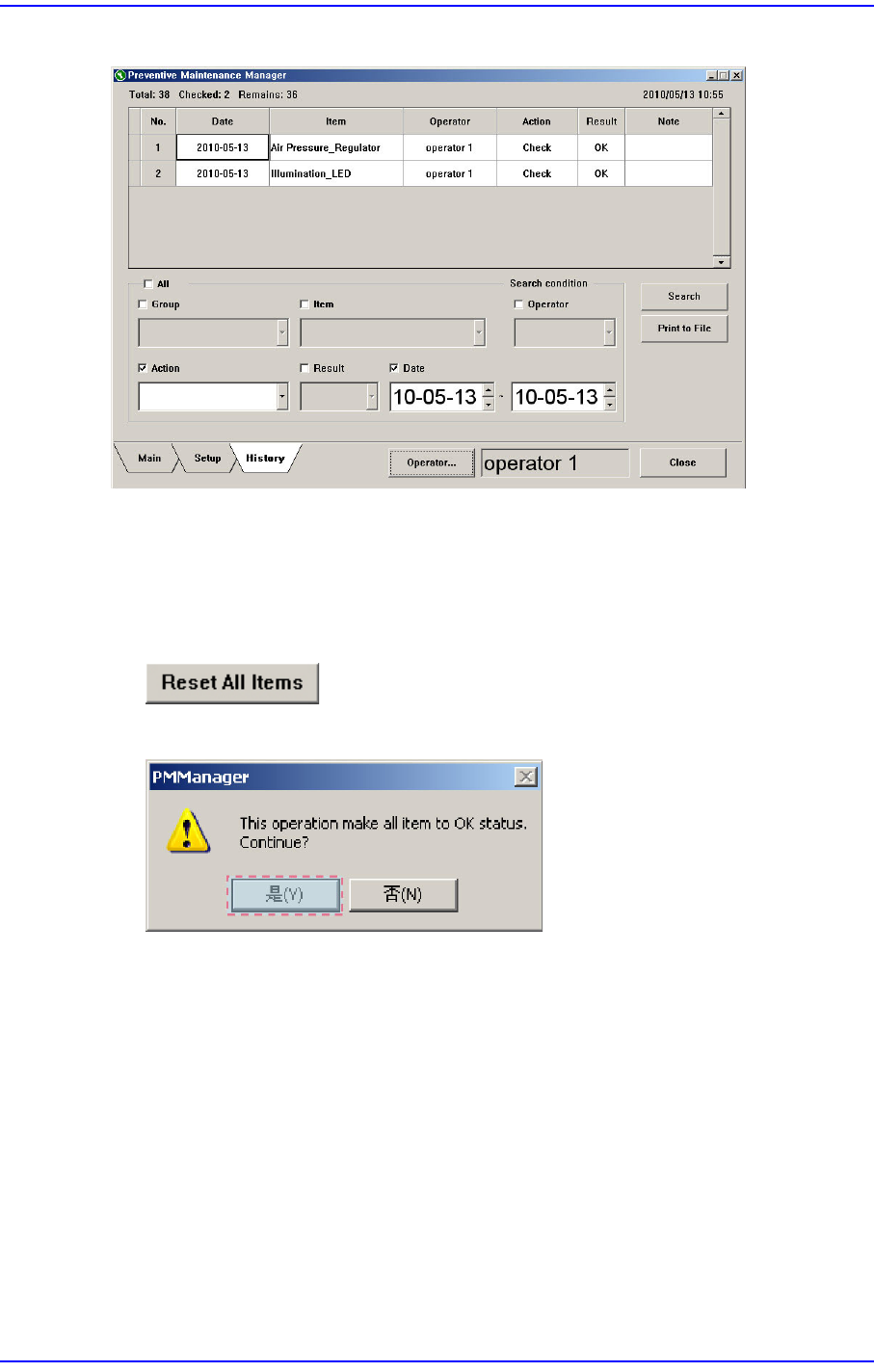16-8 Cutting-edge Modular Mounter HM Series A dministrator's Guide 图 16.7 PM Mana ger 的 Main 画面 History 画面中记录所有变更项目的历史, 同时在 Note 中显示 ”Reset all items” 。