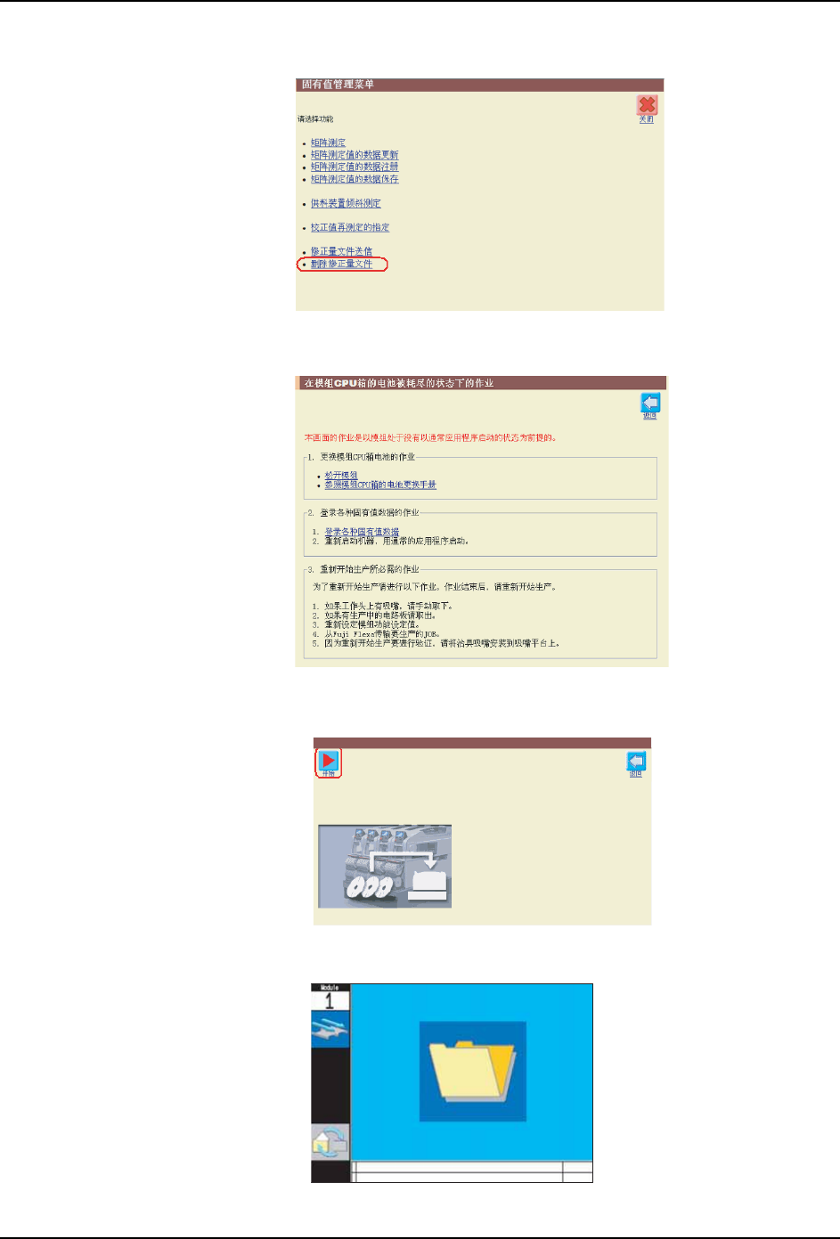 MEC-AIMEX2S-011S0 6. 更换消耗品 AIMEX IIS 机械手册 261 3. 请点击 「模组 CPU 箱电池耗尽状态下的作业」 。 4. 请点击 「登录各种固有值数据」 。 5. 请点击 「开始」 。 机器重新启动 后画面显示为正在接 受各种固有值数据。 0(&6 ⾡᭄᳝ؐⱘ䞡ᮄⱏᔩϮ g㒘&38ㆅⱘ⬉∴ߛᮁⱘ⢊ᗕϟⱘ᪡ g㒘&38ㆅⱘ⬉∴ߛᮁᯊџࠡᤶϮ 0…