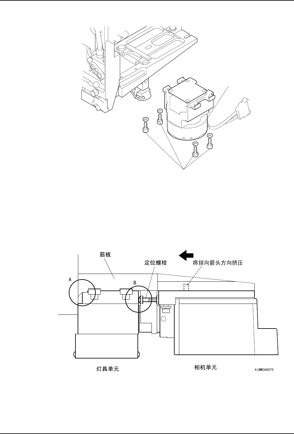 b. 请一边向箭头方向推带销部位,一边将固定照明单元和相机单元的螺栓拧紧而最终