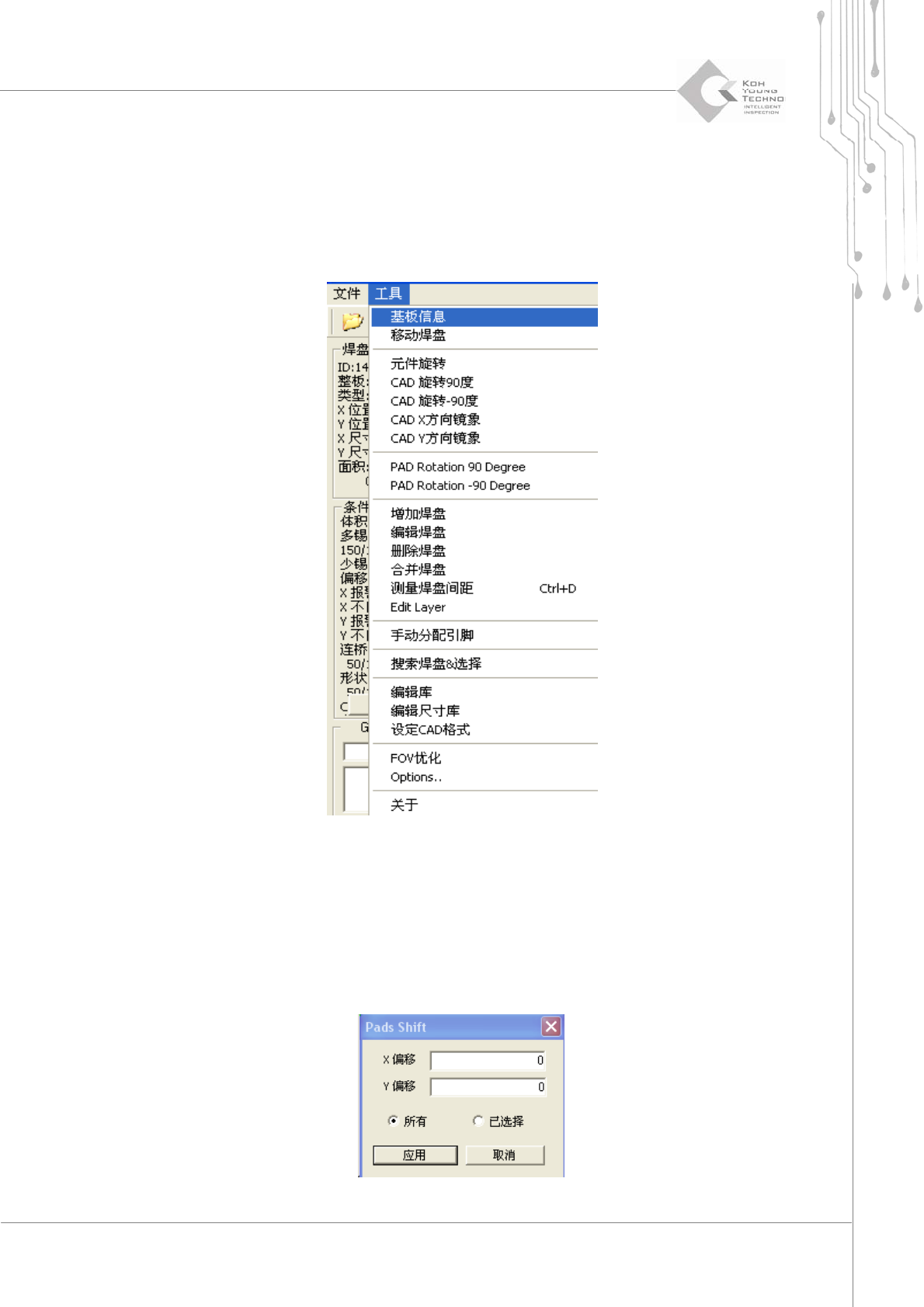 10 | 第 3 章 CEditor TM 版本 1.2 K OH Y OUNG T ECHNOLOGY I NC . 2.1.1. “ F ILE ” (文件) “ File ”(文件)菜单的主要功能包括: ¾ 载入 Pa d 文件 (*.pad) , ¾ 载入 / 保存 Job 文件 (*.mdb) , ¾ 载入 / 更改 CAD 文件, ¾ 导出 CSV 文件 (*.cs…