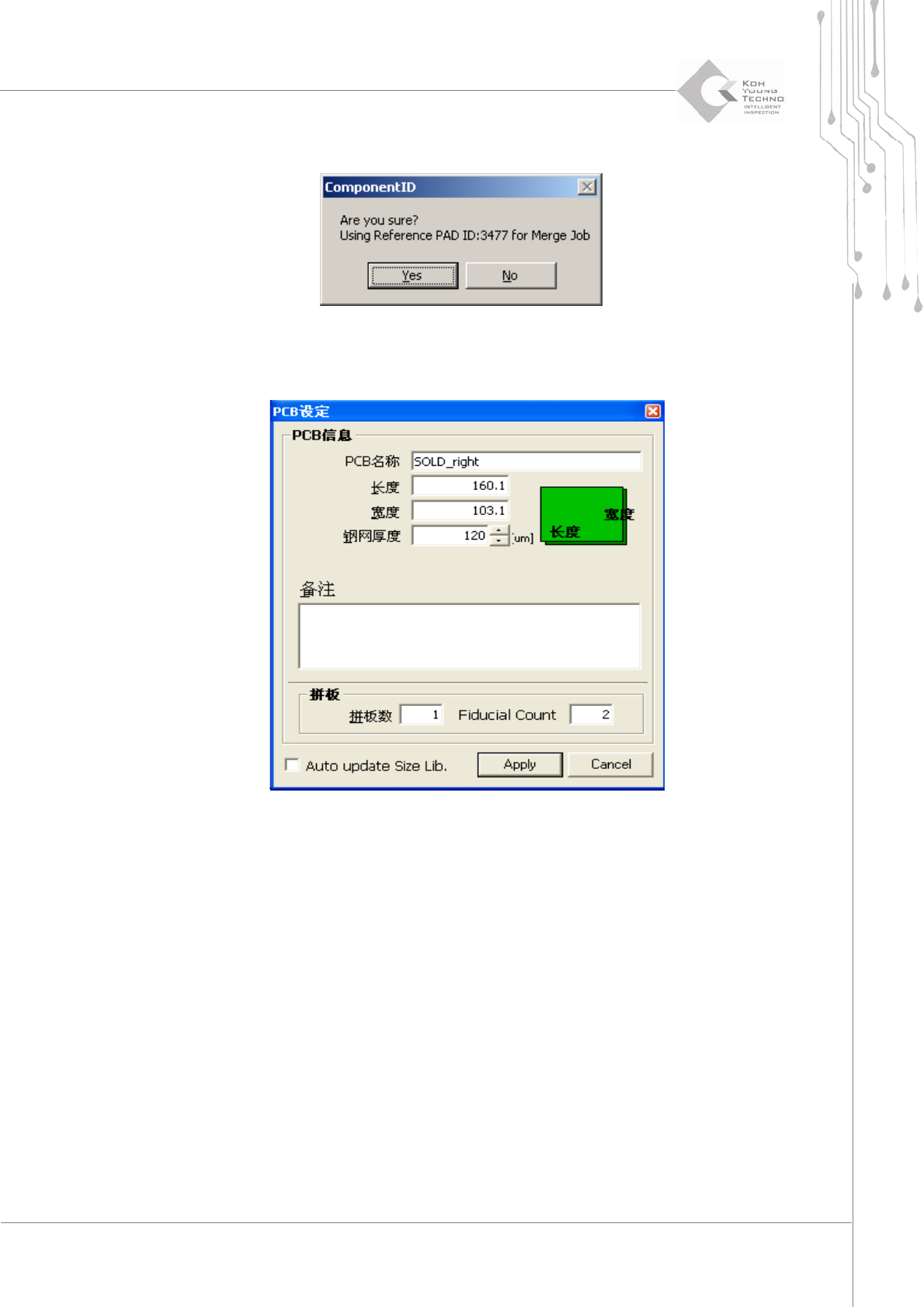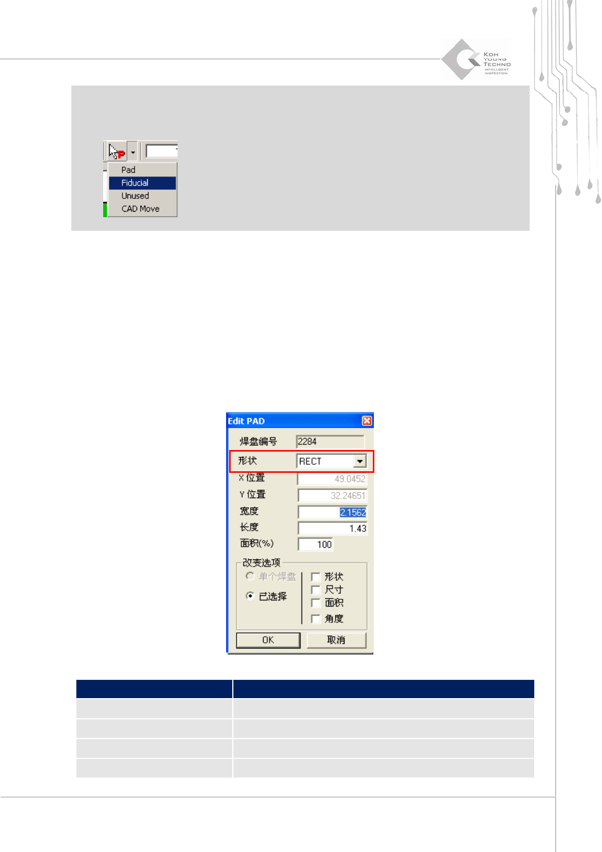 14 | 第 3 章 CEditor TM 版本 1.2 K OH Y OUNG T ECHNOLOGY I NC . OBLONG 椭圆形焊盘 N.SLOP 逆时针焊盘 P. S L O P 顺时针焊盘 G .T AB 金手指焊盘 Outside Hole 当导通孔位于扩展 ROI 时。 Inside Hole 当导通孔位于焊盘时。 B.BadMark 黑色坏标记 W .BadM ark 白色坏标记 L.F .Rect, L.F .C…
