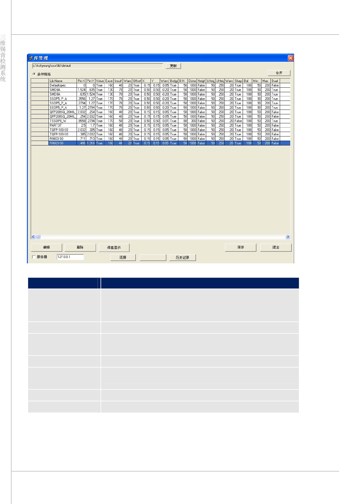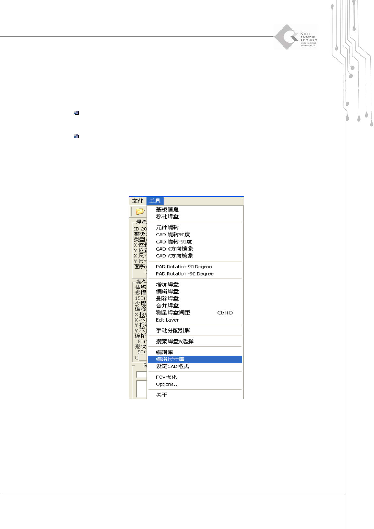 程序员手册 | 19 “ Size Library ”(尺寸库) 使用焊盘尺寸和焊盘形状并根据条件创建焊盘组。用户可自动设 定检测条件,并可将该库在所有机器间共 享。 ¾ “ Environme nt ”(环境) 安装了 CEdit or 的 Koh Yo u n g 机器或离线 PC (安 装 CEditor 软件后即可使用该尺 寸库)。 要使用库共享,必须构建网络。 ¾ 如何使用 …