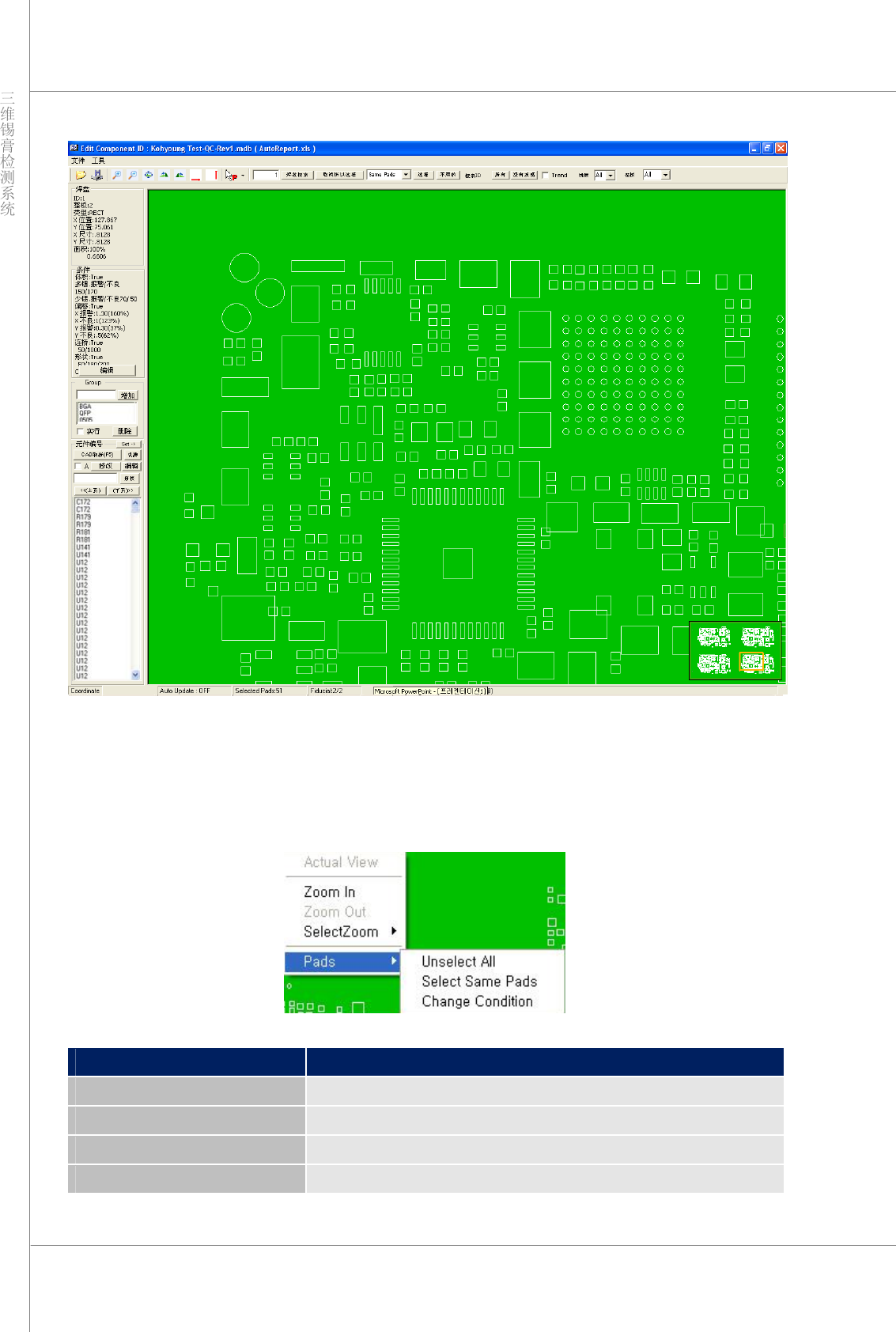 程序员手册 | 35 ¾ “ Pa ds ”(焊盘):这是用于焊盘选择的新菜单,增加了检测条件选择。可在 PCB 视图上单击 鼠标右键查看该菜单。 “ Unselect All ”(取消全 选):取消选中所有选定焊盘。 “ Select same pads ”(选择同类焊盘):选择与选定焊盘同类的所有其他焊 盘。 “ Cha nge Condition ”(更改条件):显示用于 更改检测条件的窗口。 …