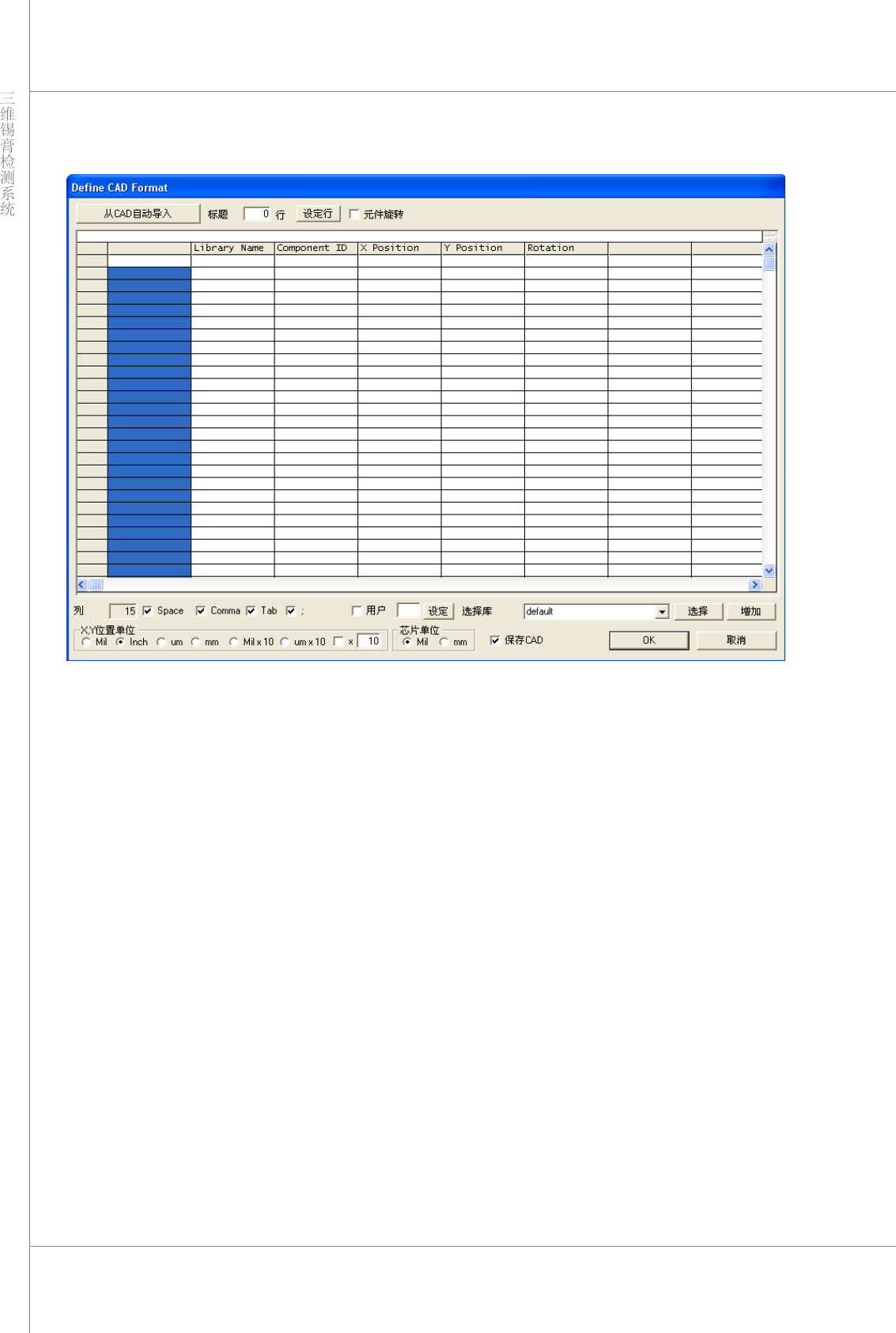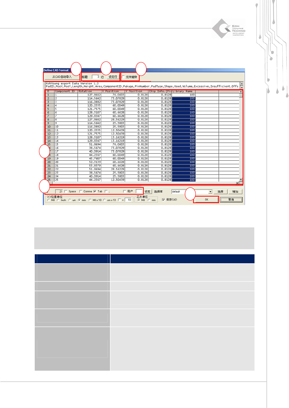 48 | 第 3 章 CEditor TM 版本 1.2 K OH Y OUNG T ECHNOLOGY I NC . 2) 下图显示了“ Define CAD Format ”(定义 CAD 格式)对话框。 图 3-5. “ Define CAD Format ”(定义 CAD 格式)对话框 (1)