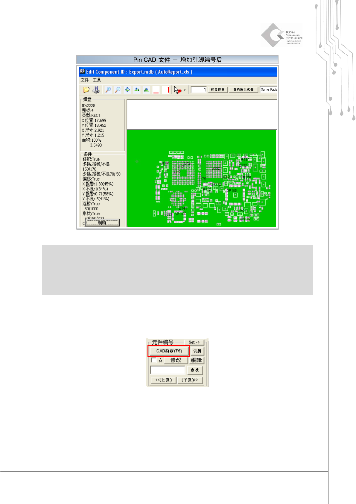 52 | 第 3 章 CEditor TM 版本 1.2 K OH Y OUNG T ECHNOLOGY I NC . 3.2.2. 质心 如果在增加 CAD 文件期间,元件编号(或引脚编号)与焊盘彼此未正确匹配,此步骤可对方向进行手动 补偿。 如果元件编号(或引脚编号)的方向与焊盘不匹配, ¾ 使用“ T ool ”(工具)菜单中的“ Mirror ”(镜像)或“ Rota tion ”(旋转),或 ¾ 使用“ …