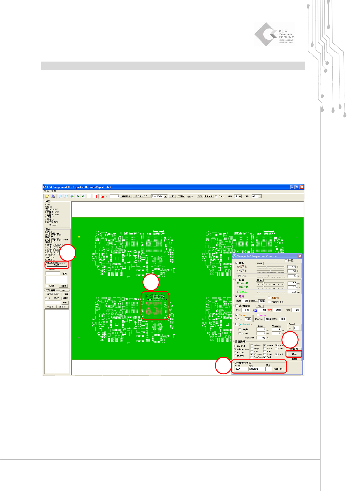 程序员手册 | 65 如何设置共面 注: 必须使用支持共面不良的 GUI 3.5.2160 以上版本。在较低版本中,通常无法执行共面。 应将元件编号相同的焊盘注册为一个部件。如果一个 PCB 具有其他相同的元件编号,则必须将 PCB 分为 面板或阵列来对 PCB 进行检测。 执行 CEditor 并打开 Job 文件。 执行以下第 ①~④ 步,应用 CAD 。否…