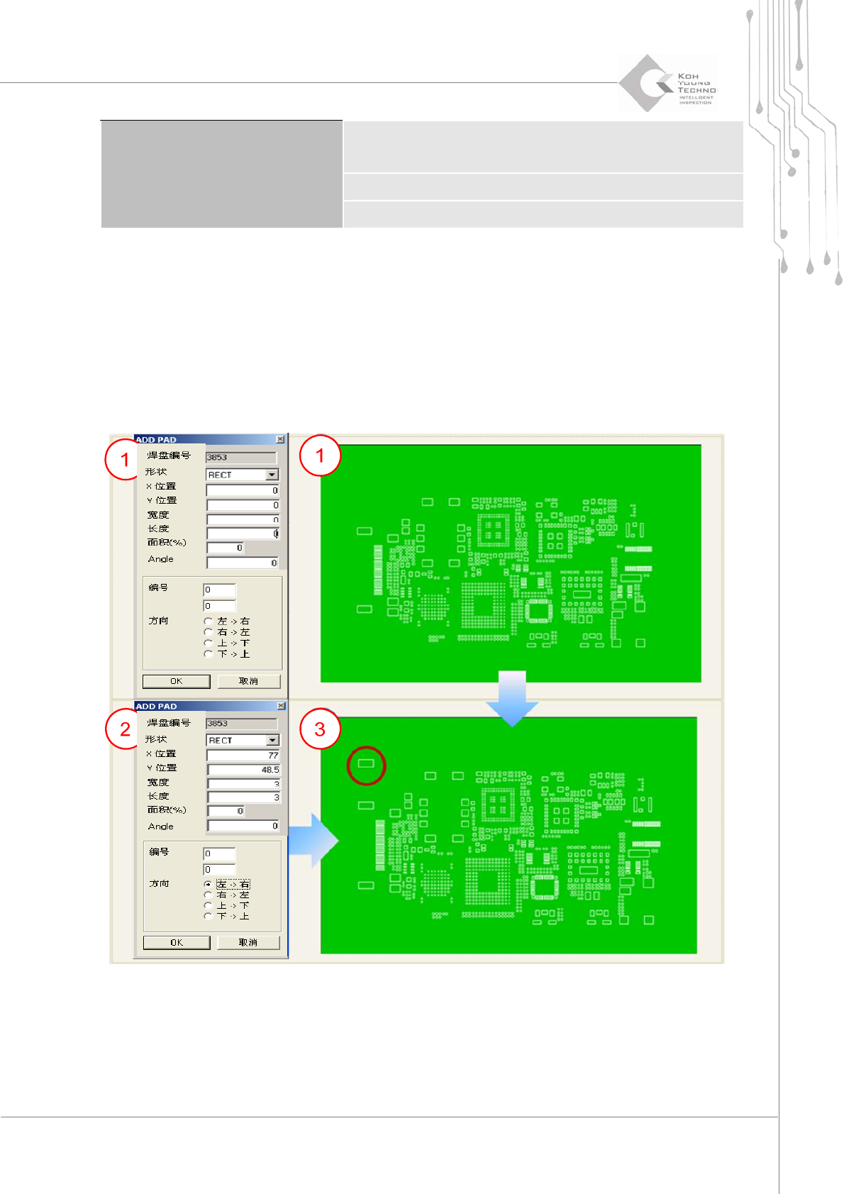 68 | 第 3 章 CEditor TM 版本 1.2 K OH Y OUNG T ECHNOLOGY I NC . 4.2. 增加 / 编辑焊盘 CEdito r ™ 允许用户在载入 Pa d 文件 (*.mdb) 或 Job 文件 (*.md b) 后增加或编辑特定焊盘。当输入的 Pa d 文件 (*.pad) 不正确并对 PCB 检测产生影响时编辑焊盘非常有效。此外,由…