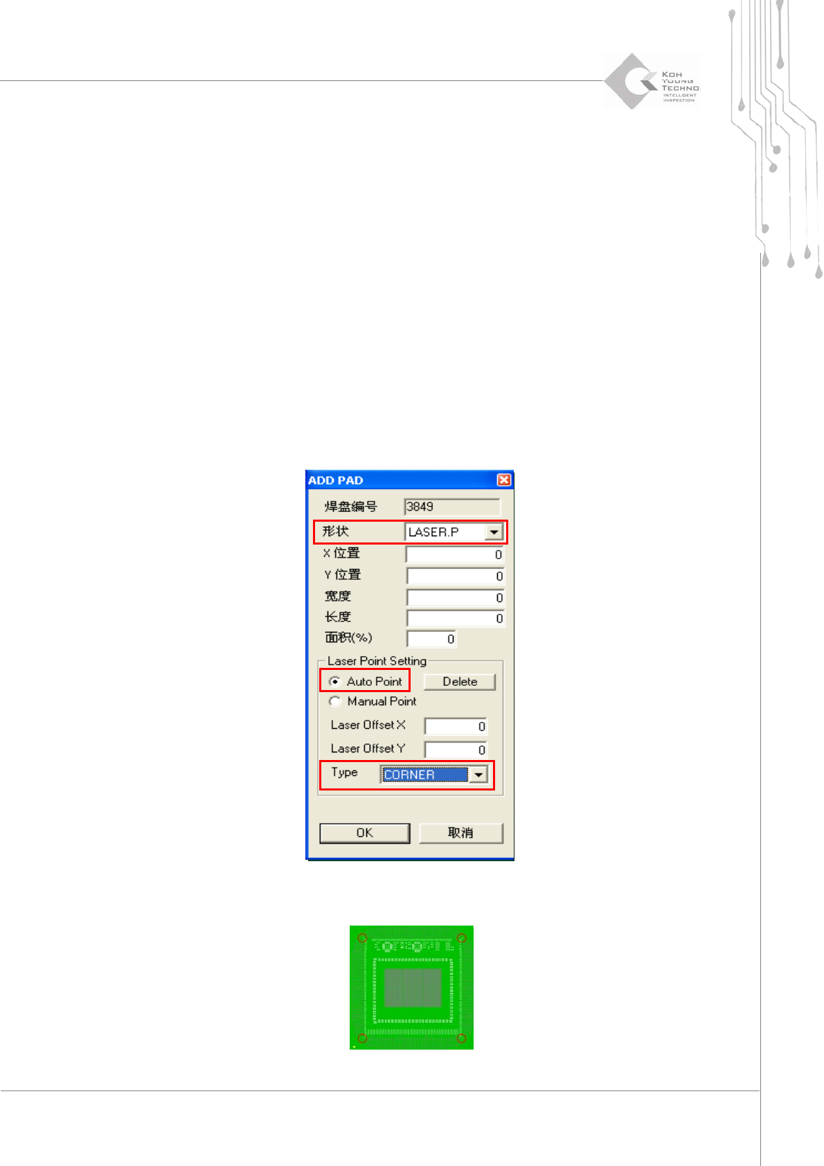 72 | 第 3 章 CEditor TM 版本 1.2 K OH Y OUNG T ECHNOLOGY I NC . 4.2.2.2. 如何设定中心 1) 在“ T ools ”(工具)中选择“ Add PA D ”(增加焊盘)。 2) 将“ Shape ”(形状)设定为“ LASER.P ”(激光点)。 3) 在“ La ser Poi nt Settin g ”(激光点设置)中选择“ Auto Poi n …