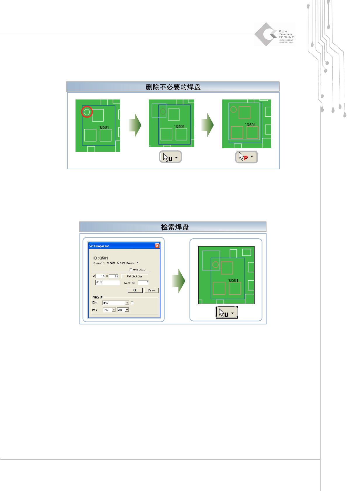 程序员手册 | 77 4.3.3. 案例 3 以下示例与案例 1 类似。但是,不能通过简单的调整范围大小来修改元件编号。 1) 将鼠标模式改变为“ Unused mode ”(未使用模式),并选择希望处于未使用状态的焊盘。选定 焊盘将从搜索区域中移除。 2) 将鼠标模式改变为 “ Pa d Mode ”(焊盘模式),并遵循与案例 2 相同的步骤。 3) 最后,将未使用的焊盘改变为已使用焊盘。将鼠标模式…
