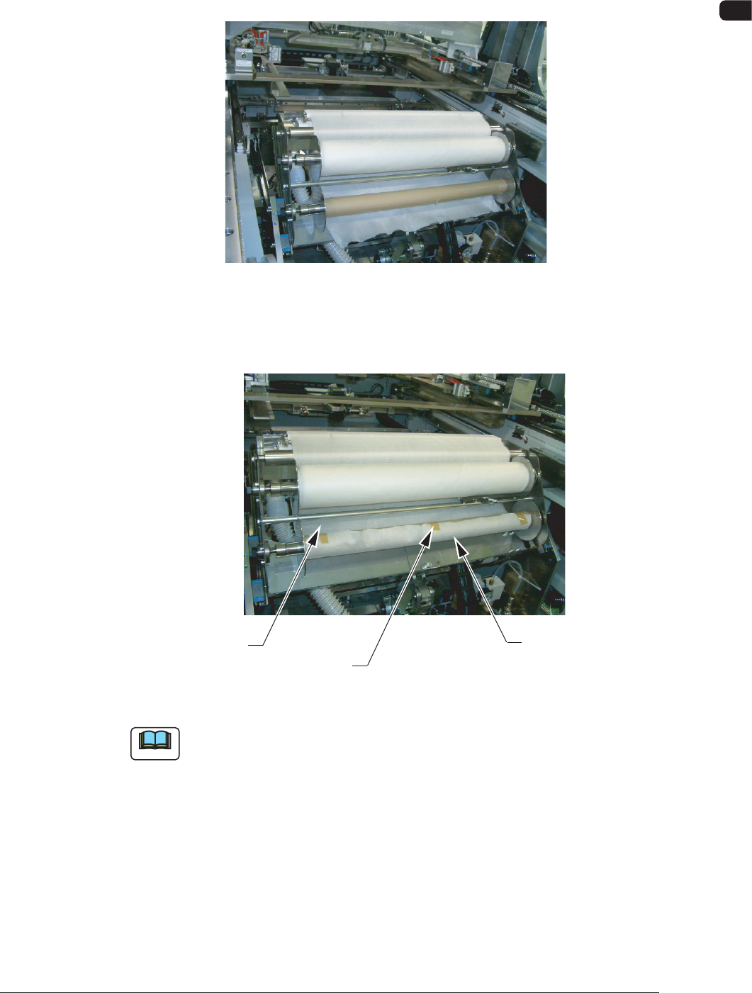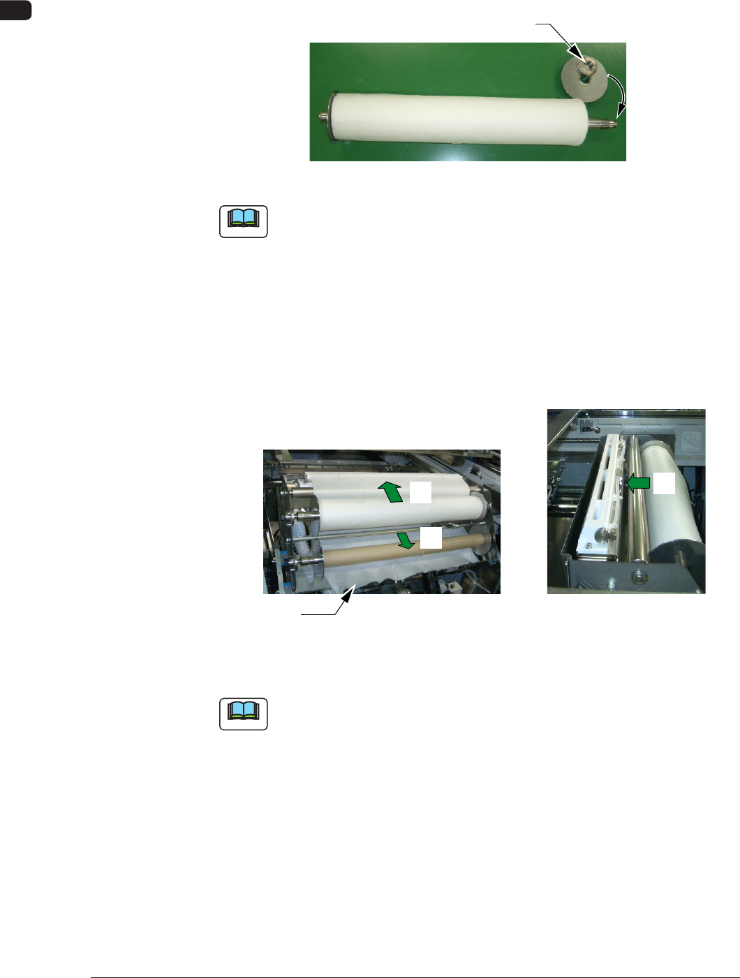 4OM-1505 1-49 4. Maintenance Method : Chap.1 (9) Set the roller on the feed (take-up) side, supporting it so that the left adaptor can be inserted into the hole on the left side of the cleaning unit. Set it up by pressin…