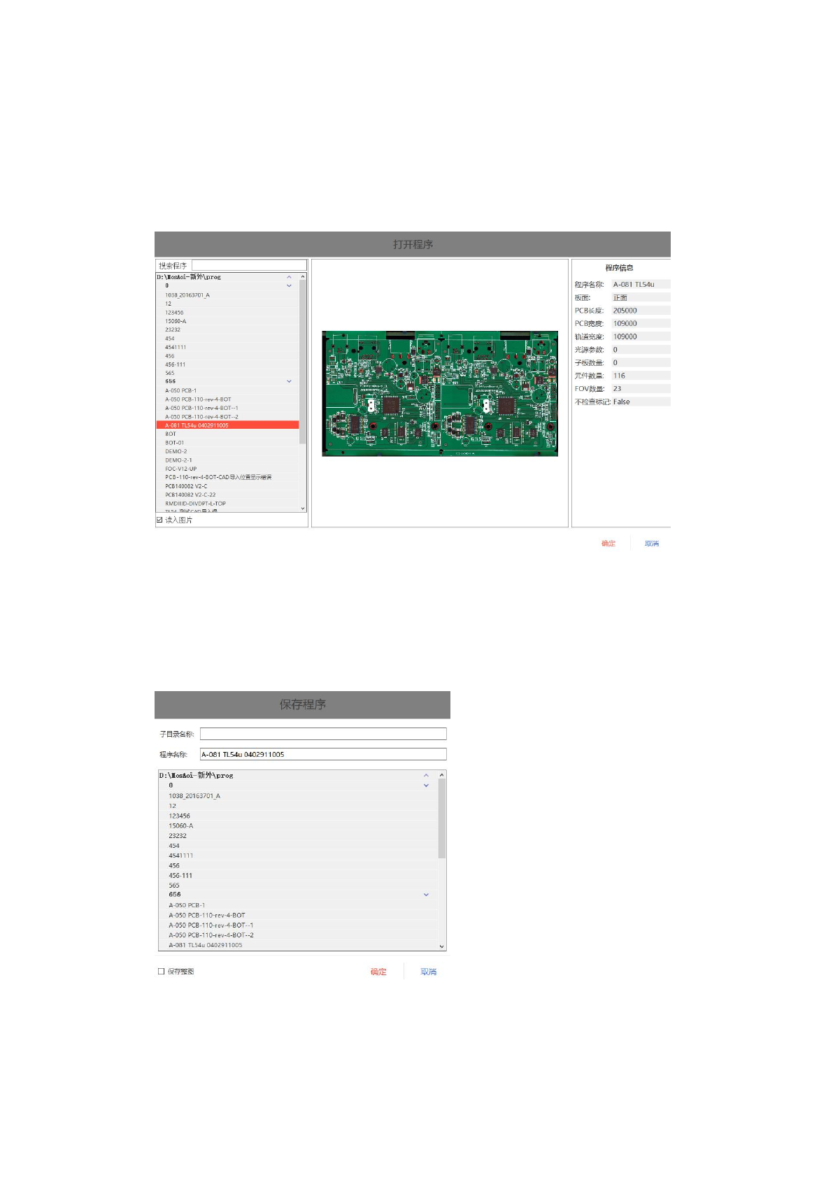 选中相应的程式,点“确定”,即可载入程式会把电路板图像载入进来,点“取消”,退出不