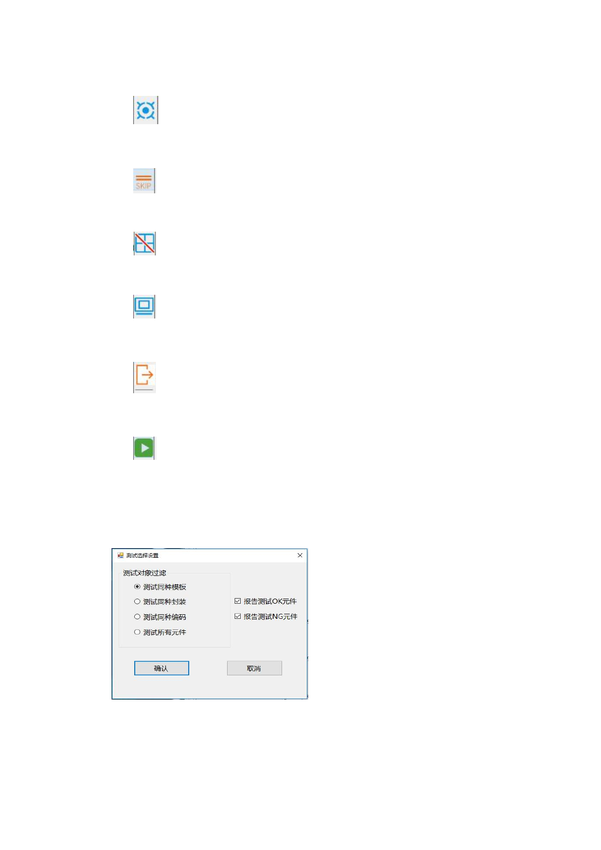 选择测试同种模板、测试同种封装、测试同种编码、测试所有元件,将按与选中的元件