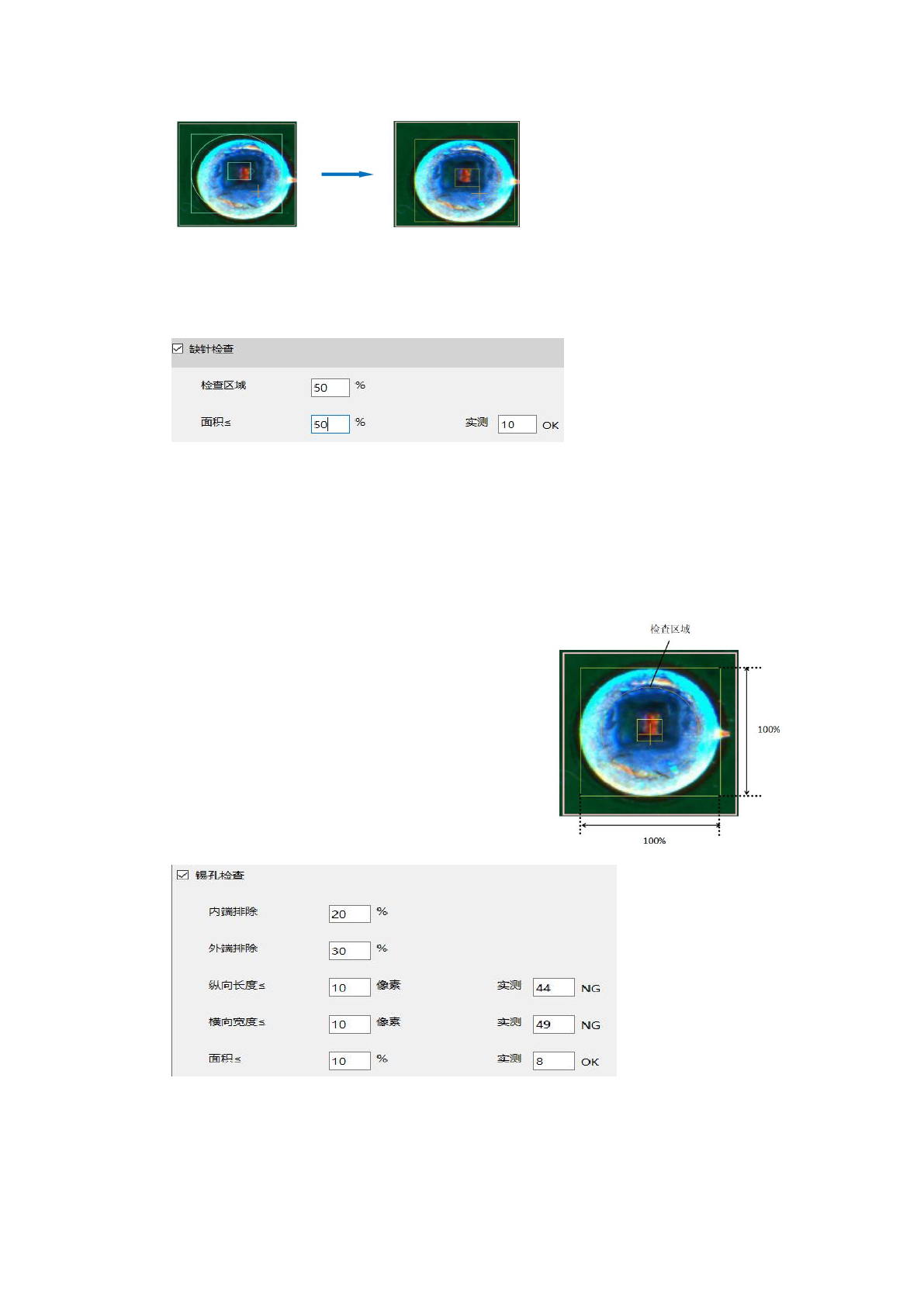 积占检查区域的比例,小于等于面积设定值,则 OK,大于面积