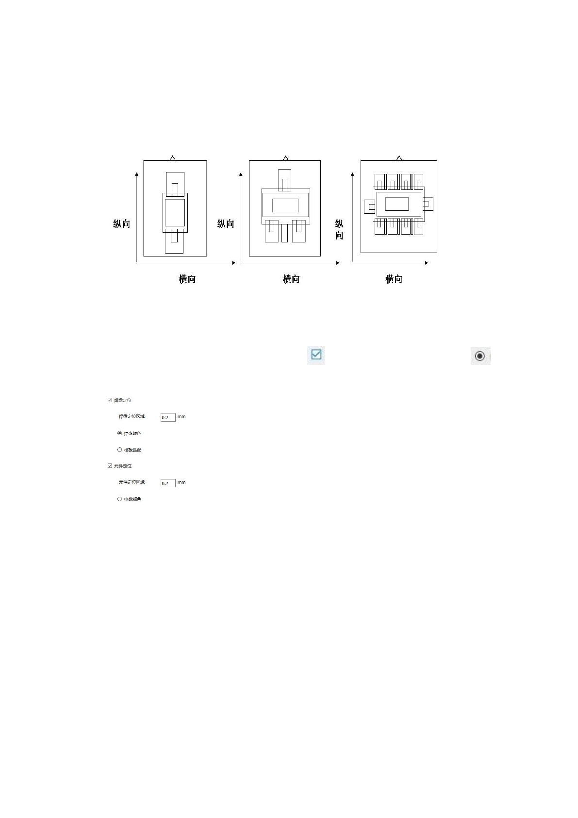 第 6 页 共 79 页 1.3 检查窗口 1) 检查窗口的箭 头方向为纵向,垂 直于箭头方向 为横向,如下 图: 2) CHIP 类、 SOT 类的焊盘箭头 方向需要朝外 (朝里是指向元 件) , IC 类引脚定位窗需 要朝外(朝里 是指向元件) 。 3) 每种检查窗口 至少有 1 种算 法, 使用勾选 , 如不 使用, 不勾 选, 可以 多选; 点为单选,对 于并行的算法 只能选择 1 种,如下 图: 4) 算法 原理, 窗口 是计…