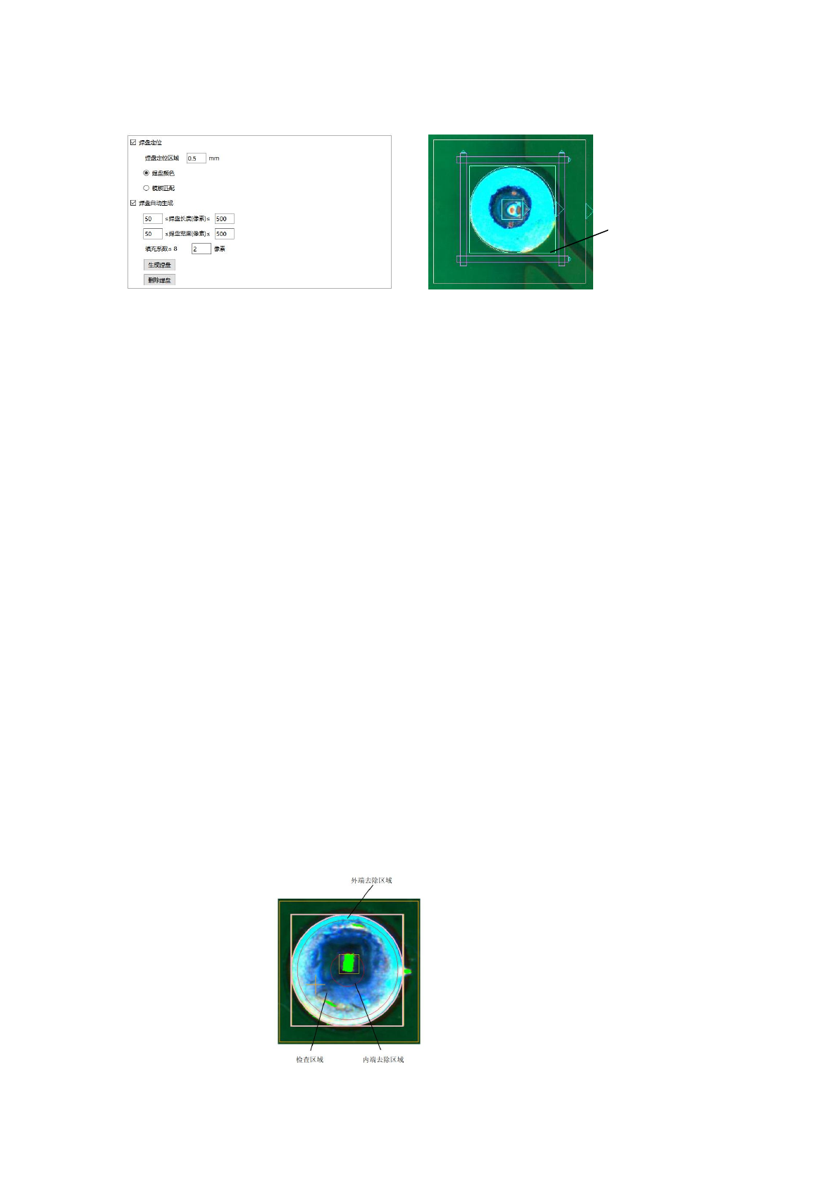 第 75 页 共 79 页 点中焊盘露铜 的任一设定, 可以进行抽色,此 项抽取红色( 露铜颜色) 处理内 容 : 1 ) 内端 排除: 以抽 出的焊盘窗口 为 100% ,由焊盘中心向外 排除区域不检 查 2 ) 外端 排除: 以抽 出的焊盘窗口 为 100% ,由焊盘末端向里 排除区域不检 查 3 ) 四等 分焊盘 : 把检查 区域平均分 成四个相等 的检查区域 ,分别计算各 自的颜色比 例,颜 色比例最大的 为实测值 4 ) 在检…