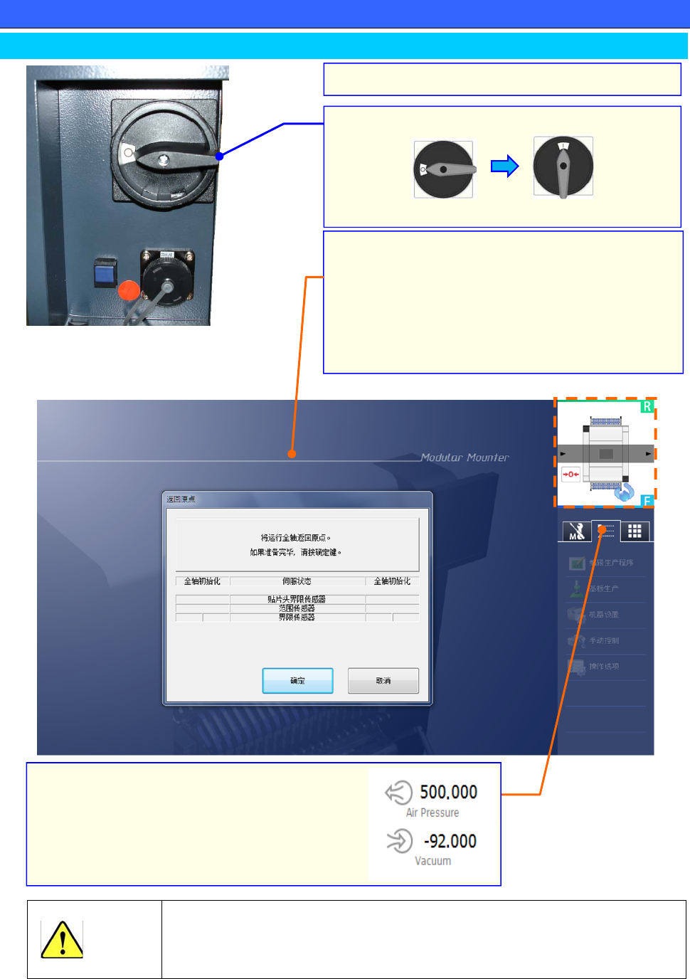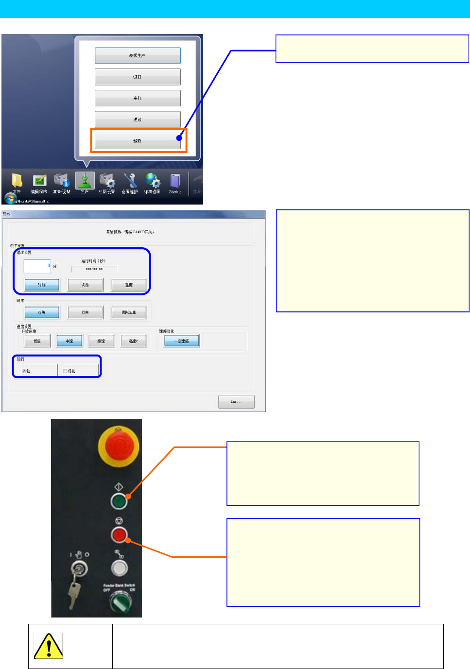 操作手册 I 3-2 3-2 操作概要 Step1 接通 主 机电源。 警告 1. 执行返回原点时,请绝对不要把手和头部等伸进装置内部。 2. 请确认装置内部没有扳手等干扰 Head 的物品。 3. 请在安全罩关闭的状态下进行返回原点。 4. 请做好随时按紧急停止按钮的准备。 3. 主机的软件启动后,画面上即显示返回原点的 提示信息。 请按「确定」 。 全轴开始移动,返回原点。 1. 请确认设备内部没有放置基板或工具等物品。 2. 把主…