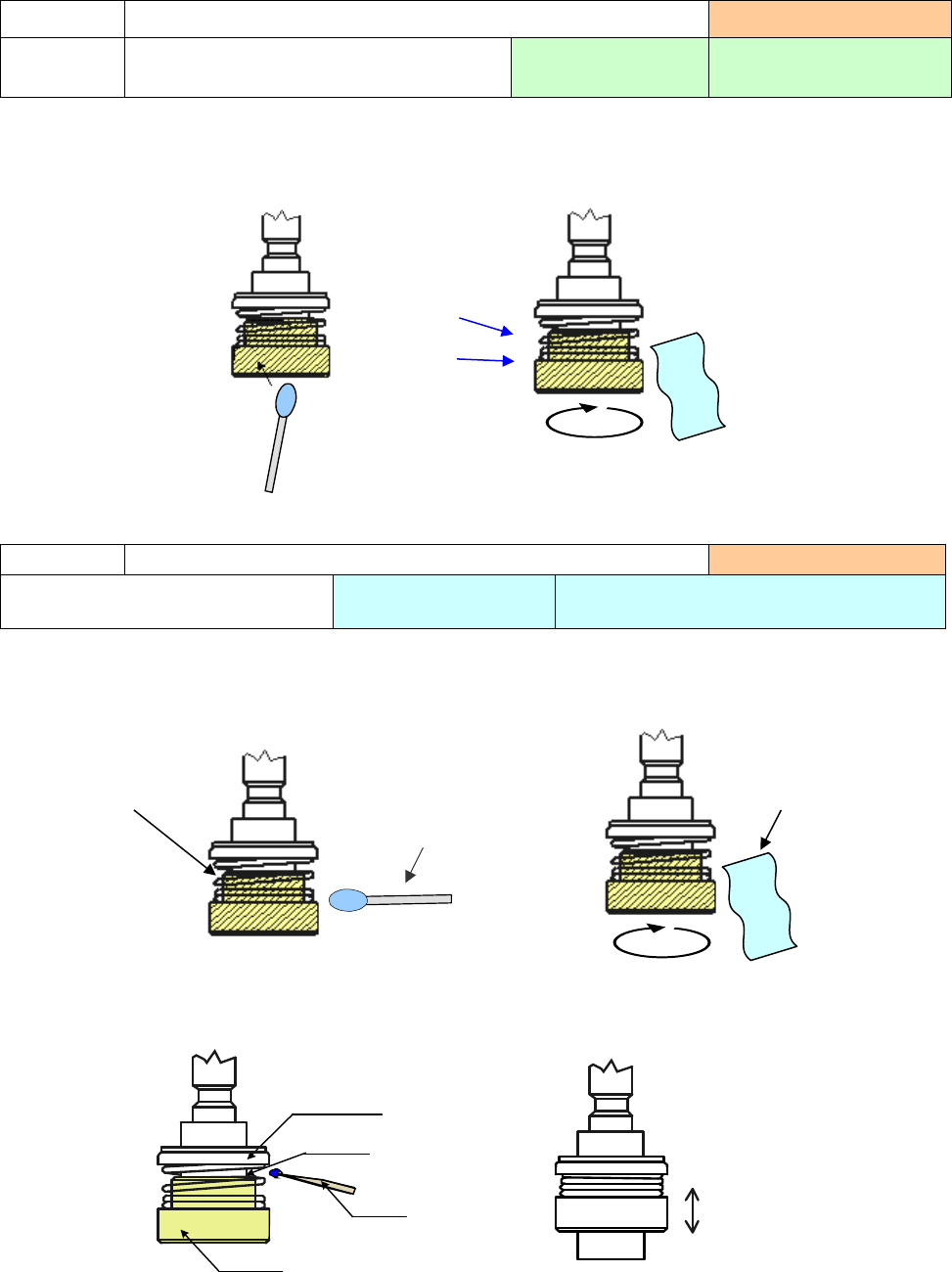 操作手册 I 4- 20 1) 用棉花棒浸湿酒精,清扫吸嘴外圈的内部。 2) 用酒精把吸嘴外圈表面部分和弹簧部分擦干净。 1) 吸嘴外圈, 以及吸嘴外圈与外圈弹簧支架之间, 要用沾油的棉花棒进行涂抹。 涂抹后, 用气枪吹掉多余 的油,再用抹布擦干净。 2) 为使吸嘴外圈滑动滑润, 请在涂抹润滑油部位上 (吸嘴外圈和外圈弹簧支架的缝隙部分) , 用牙签头等 沾上米粒大的 6459 润滑油 N 进行涂抹。 3) 把吸嘴外圈上下滑动 20 ~…