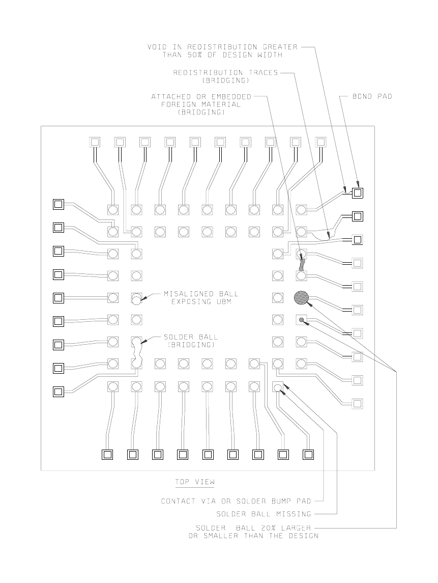 d. Any attached or embedded foreign material bridging balls, or redistribution metalization.