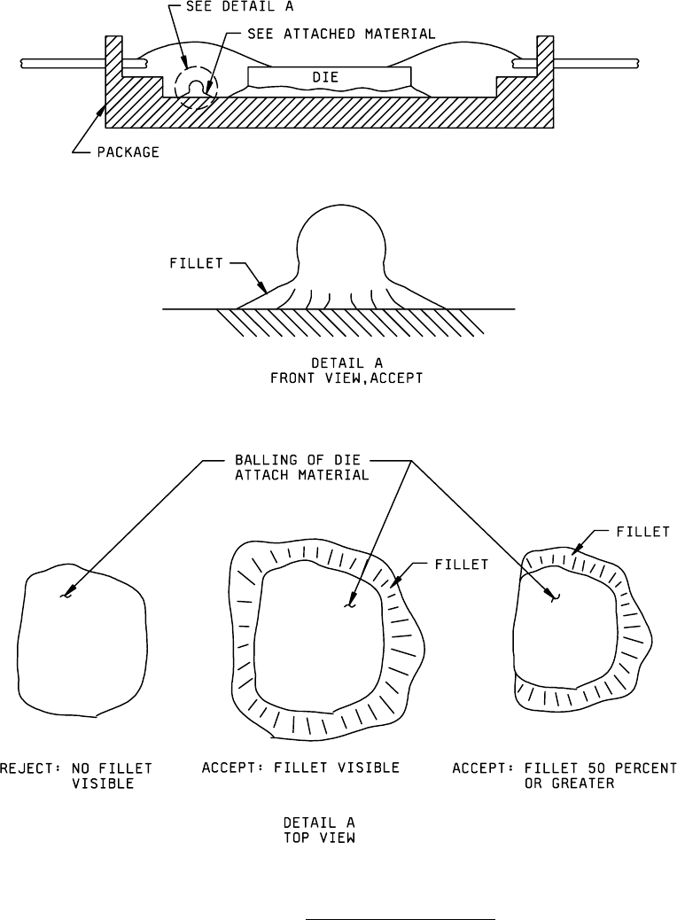 b. Die mounting material (eutectic wetting) not visible around at least two complete sides or 75 percent of the die