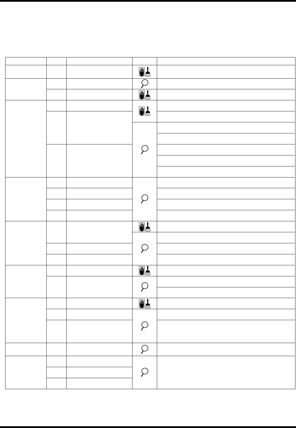 AVK3 维修手册 6.2 检查和润滑 D77MCC-80-020-C0 6.2-2 6.2.3 定期检查项目 下表根据不同的周期总结了定期检查项目。 = = 使用这些表来找出检查位置所在和有关润滑剂的详细情况。 单元栏中的数目表示了要参考的相关章节。 检查(每天) 单元 编号 项目 工作 描述 6.2.4 XY 工作台 a. 光电传感器 清除油或灰尘。 a. 基准销 确保基准销平稳地插入。 6.2.5 定位器单元 b. 光电传…