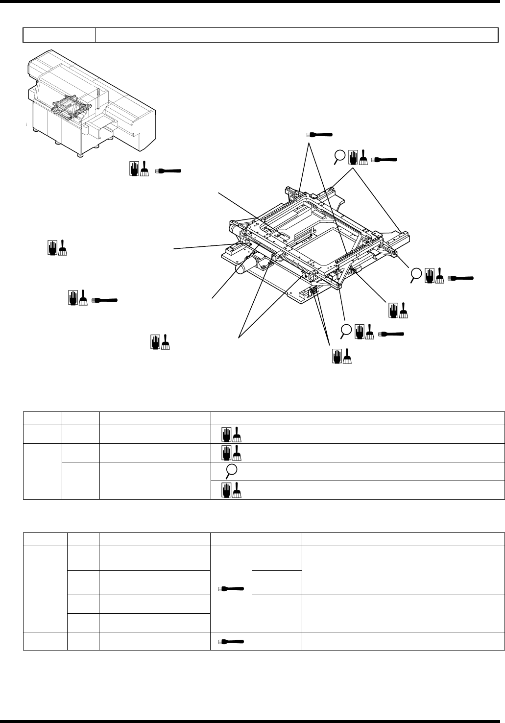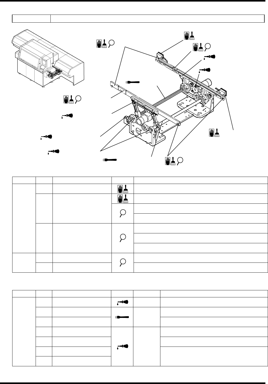 AVK3 维修手册 6.2 检查和润滑 D77MCC-80-020-C0 6.2-1 1 6.2.5 定位器单元 装置编号: 1087114000 检查 周期 编号 项目 工作 描述 a. 基准销 确保基准销平稳插入。 每天 b. 光电传感器 清除油或灰尘。 确保基准销没有松动。 每周 c. 基准销 确保基准销没有磨损或损坏。 加油润滑 周期 编号 项目 工作 加油量 描述 1. 轴转子 1 至 2 滴 每月 2. 轴滑动表面 …