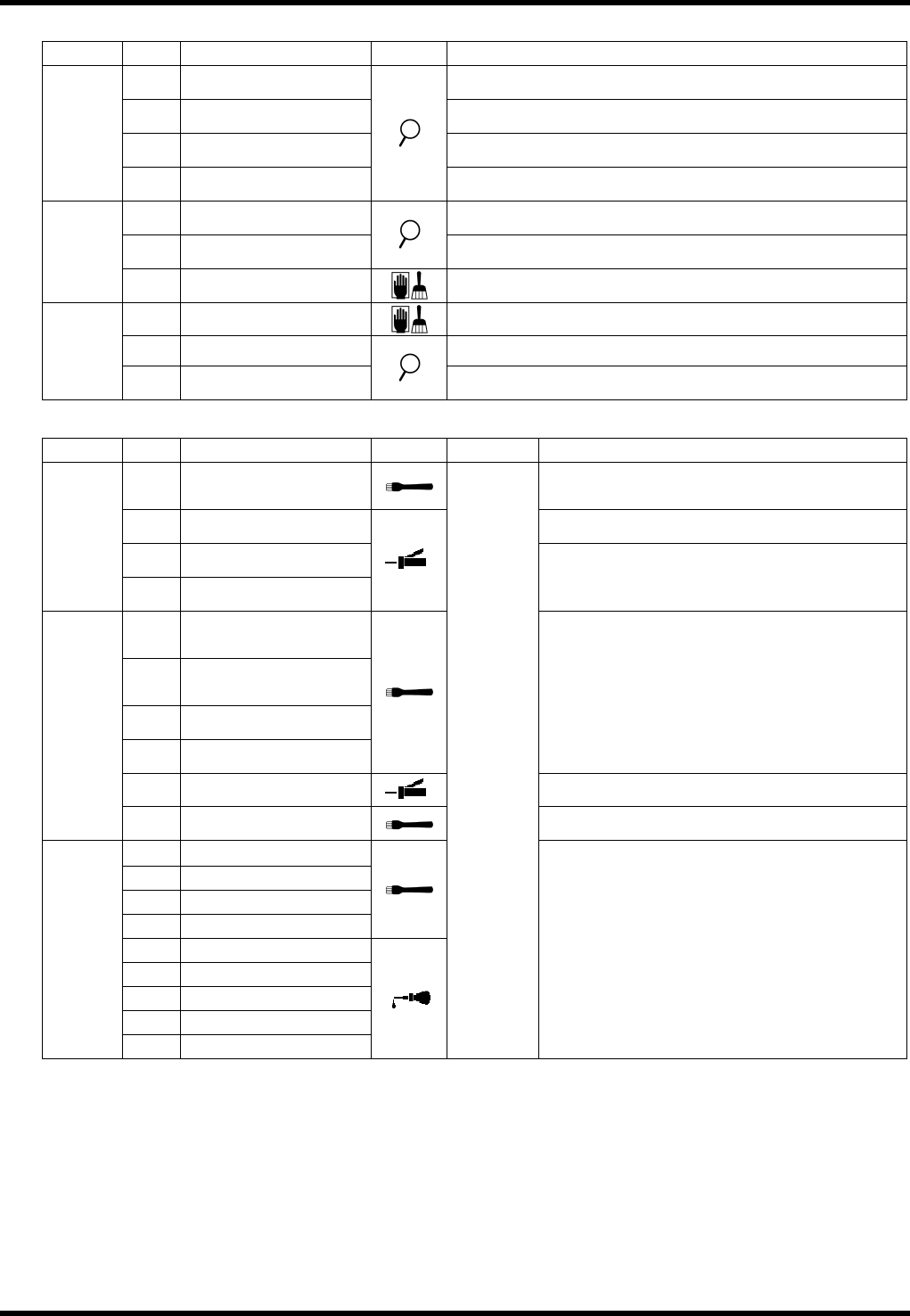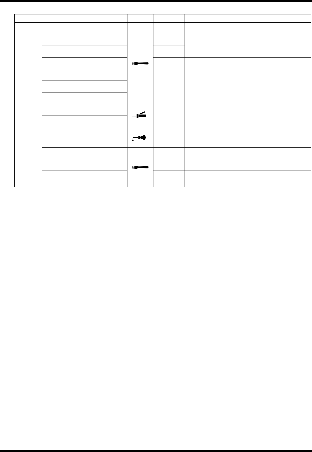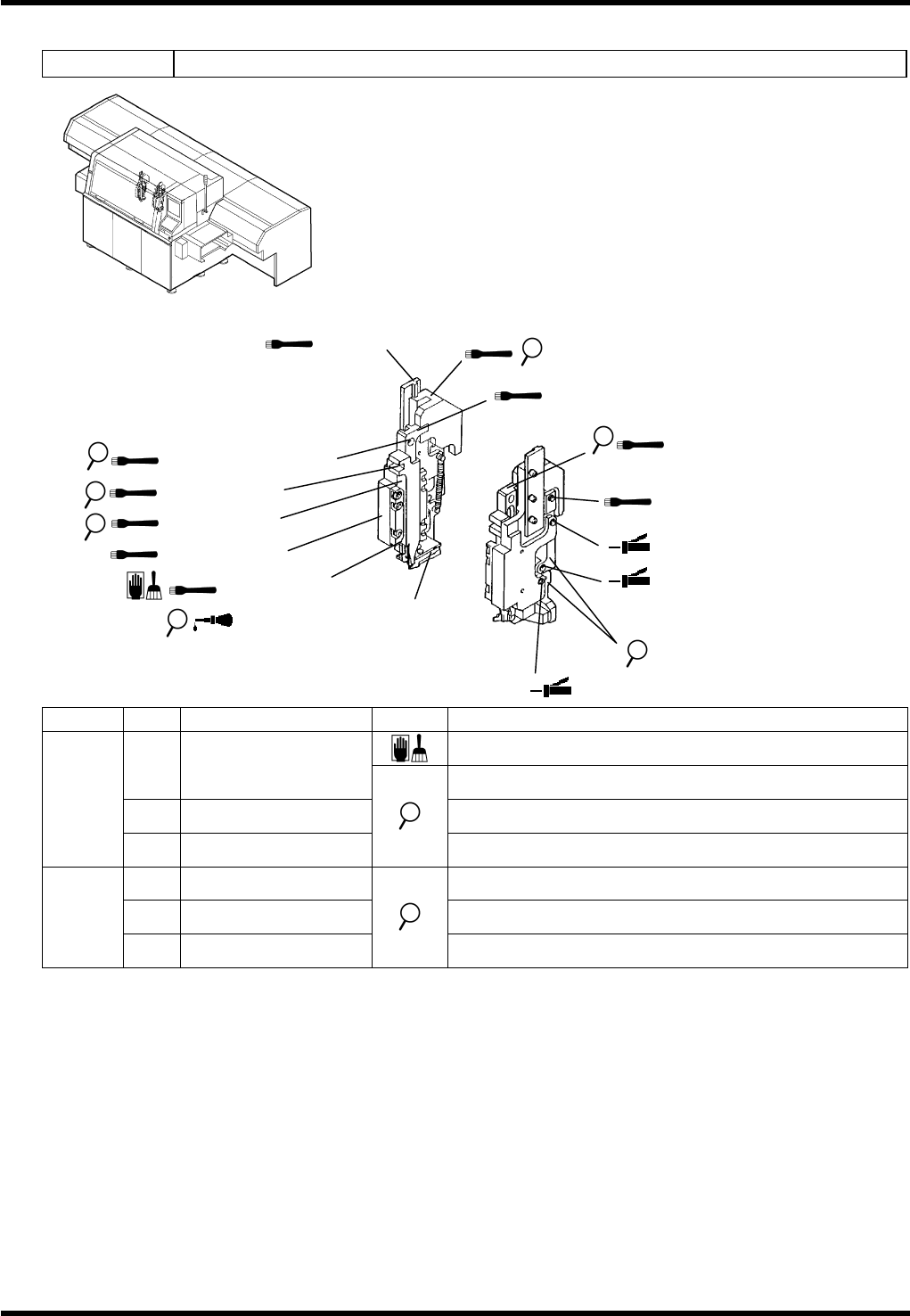 AVK3 维修手册 6.2 检查和润滑 D77MCC-80-020-C0 6.2-15 6.2.8 插入单元 装置编号: 1087110000 检查 周期 编号 项目 工作 描述 清除异物或灰尘。 a. 切刀刀片 确保切刀刀片没有磨损或损坏。 b. 插入导杆 确保插入导杆没有磨损或损坏。 每天 c. 折弯模具 确保折弯模具的顶部没有磨损或损坏 。 d. 滑动单元 确保滑动单元滑动平稳。 e. 推进器 确保推进器移动平稳。 每周 f.…