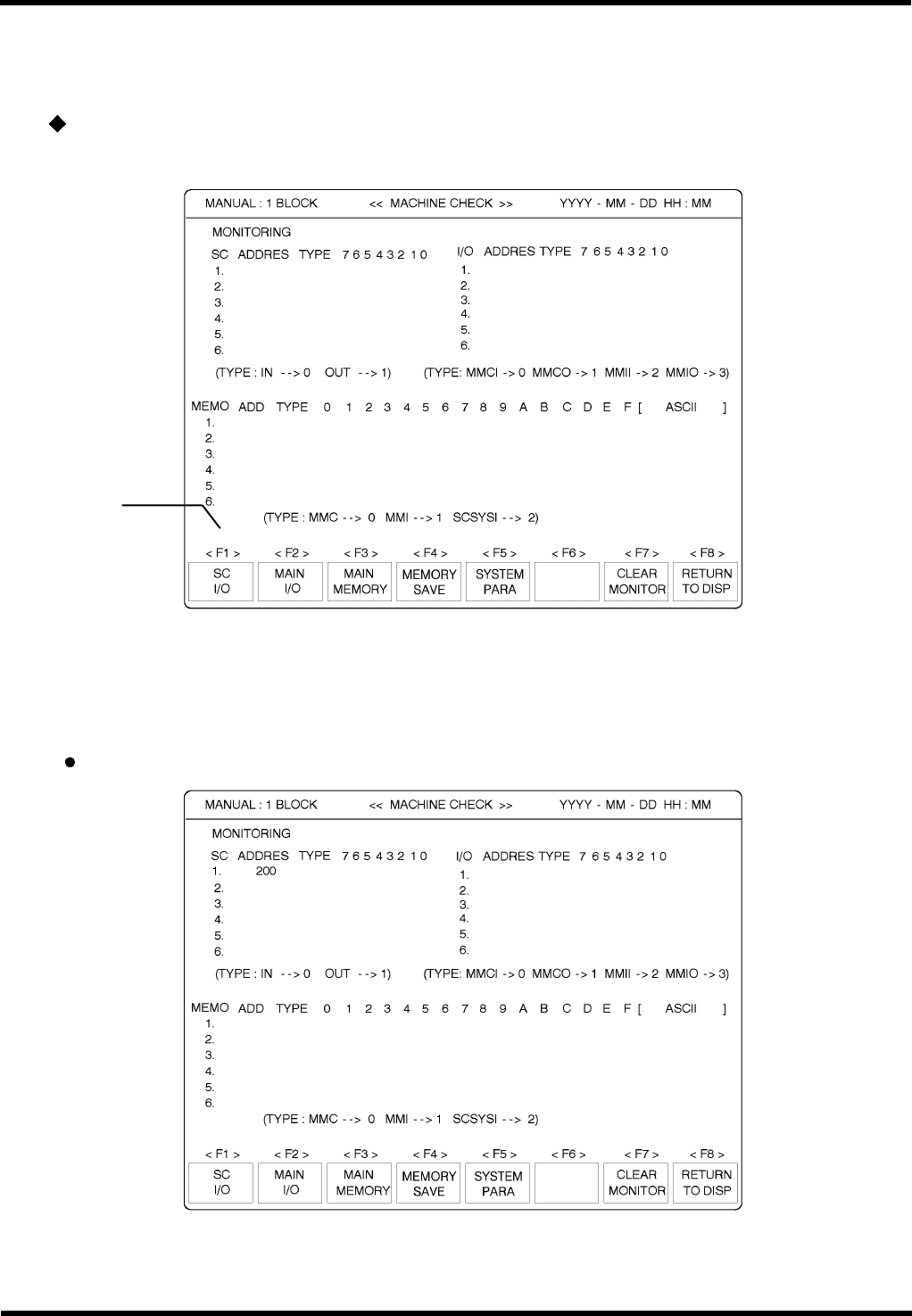 AVK3 维修手册 8.2 监测 D77MCC-71-020- A0 8.2-2 3. 调用监测屏幕。 按“ F2 ” (MONITORING[ 监测 ]) 键。 = 提示 = 显示内容为上一次地址输入的监测结果。