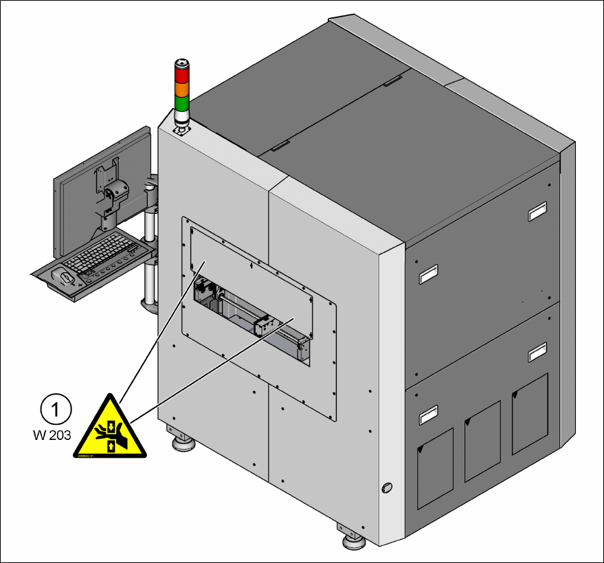 用户手册 ASM ProcessLens 02/2017 2 安全 2.2 警告标签 19 2.2.2 设备内的警告标签 图6: 警告标签 - 正视图 - 内部 - 第 1 部分 1 W 202 [03149289-xx] 2 W 204 [03009343-xx] 3 请勿触摸