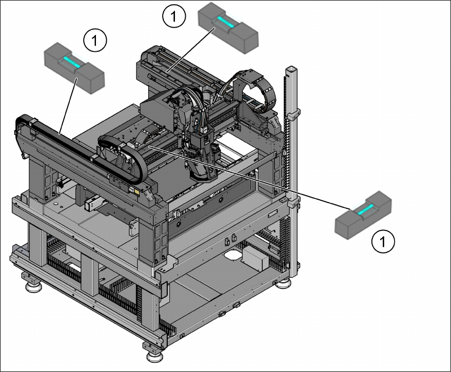 ► 将设备水平仪放到线性导轨 (1) X 和 Y 轴方向上。