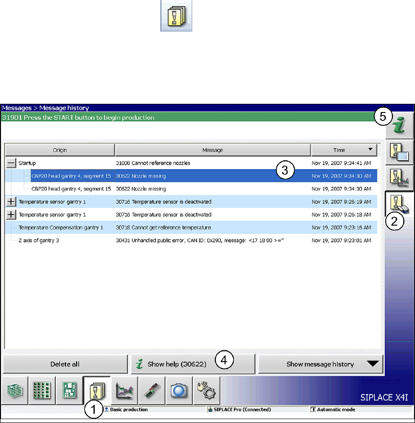 Käyttöohje SIPLACE X-sarja 5 Koneella suoritettavat tehtävät Ohjelmistoversiosta 706.1 SP1 alkaen Painos 10/2014 5.6 Hälytystiedot ja online-ohje 287 5 Kuva 5.6 - 1 Hälytysilmoitus näkymässä "T uotanto" (esimer…