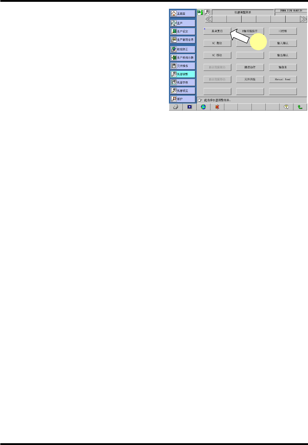 RL131 维修手册 9.1 移动检查 DA8MCC-71-010-A 0 9.1-2 9.1.1 返回原 点 在动作检查中使各轴动 作之前,请将 所有的轴都返回原 点之后,再使各轴动作 。 操作步骤 1. 1. 在操作员模式的 “ 主菜 单 ” 画面按下 [ 工程师 ] 。 切换到工程师模式。 2. 在确认画面中输 入密码,进入工程师 模式。 3. 按下主菜单的 [ 机 器调整 ] 按钮。 显示 “ 机器调整菜单 ” 画面…