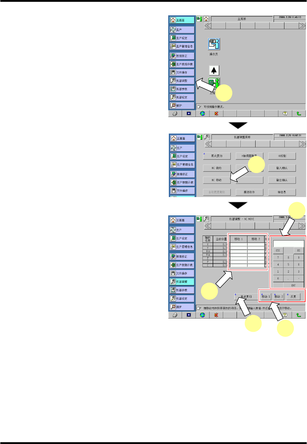 RL131 维修手册 9.1 移动检查 DA8MCC-71-010-A 0 9.1-5 9.1.3 NC 轴移动 3. 1. 按下主菜单的 [ 机 器调整 ] 按钮。 显示 “ 机器调整菜单 ” 画面。 2. 按下 [NC 移动 ] 。 显示 “ 机器调整 - NC MOVE” 画面。 3. 按下要移动的轴 名称的 [ 移动 1] 、 [ 移动 2] 。 4. 输入移动坐标。 5. 按下 <ENABLING ( 启动 )&…