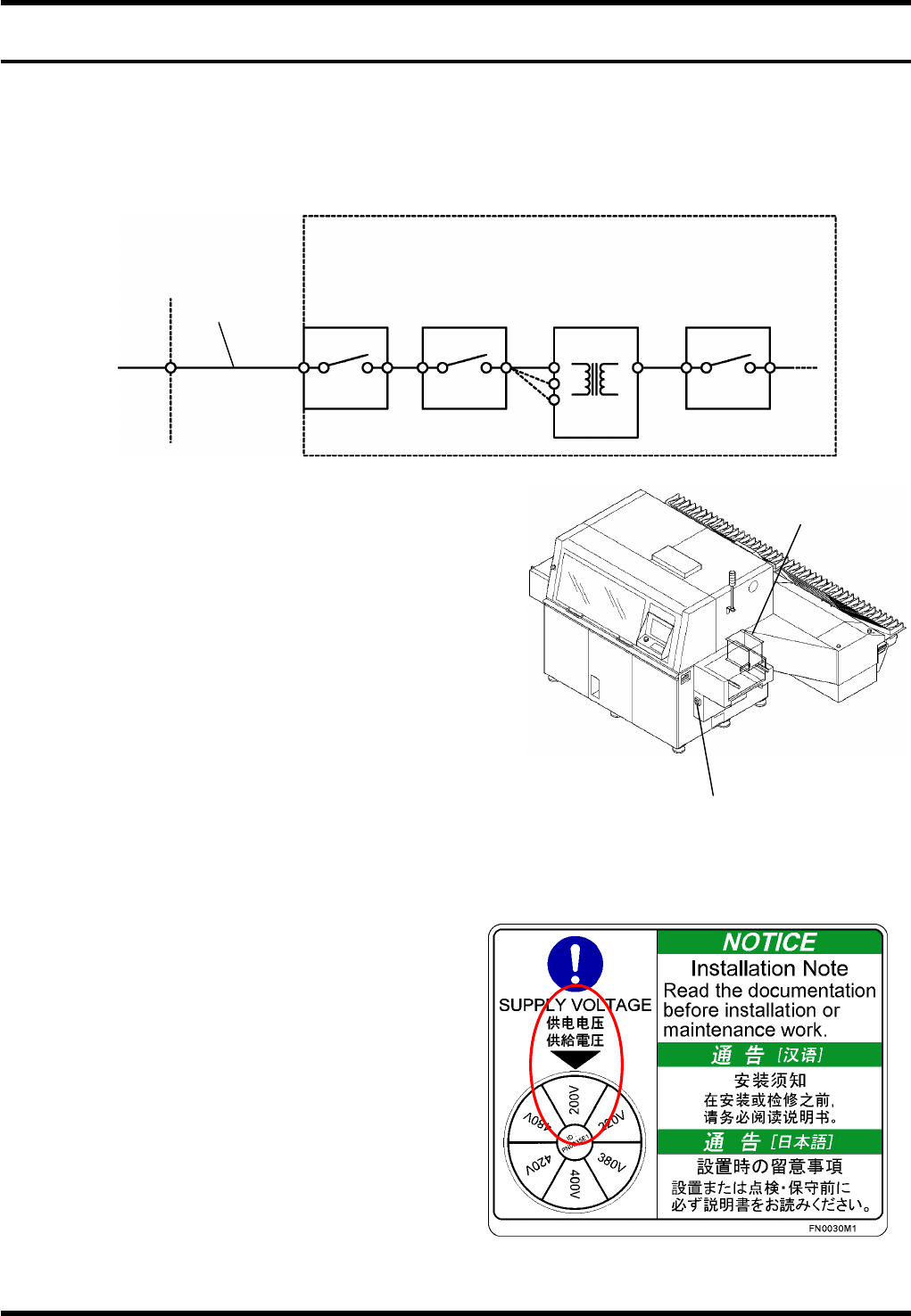 RL131 维修手册 3.2 连接电源 DA8MCC-11-020-A 0 3.2-1 3.2. 连接电源 DA8MCC-11-020-A0 该节介绍了机器电源线 的连接方式。 有关详情,请参阅个别 的手册中的接 线图。 3.2.1 概述 RG131 配置有降压变压器。 机器接线方式如下: 1) 主电源开关 ® 断路器 2) 断路器 ® 降压 变压器 3) 降压变压器 ® 后面的设备 降压变压器的电压是由 工厂按照用户 指定的数值进行配…