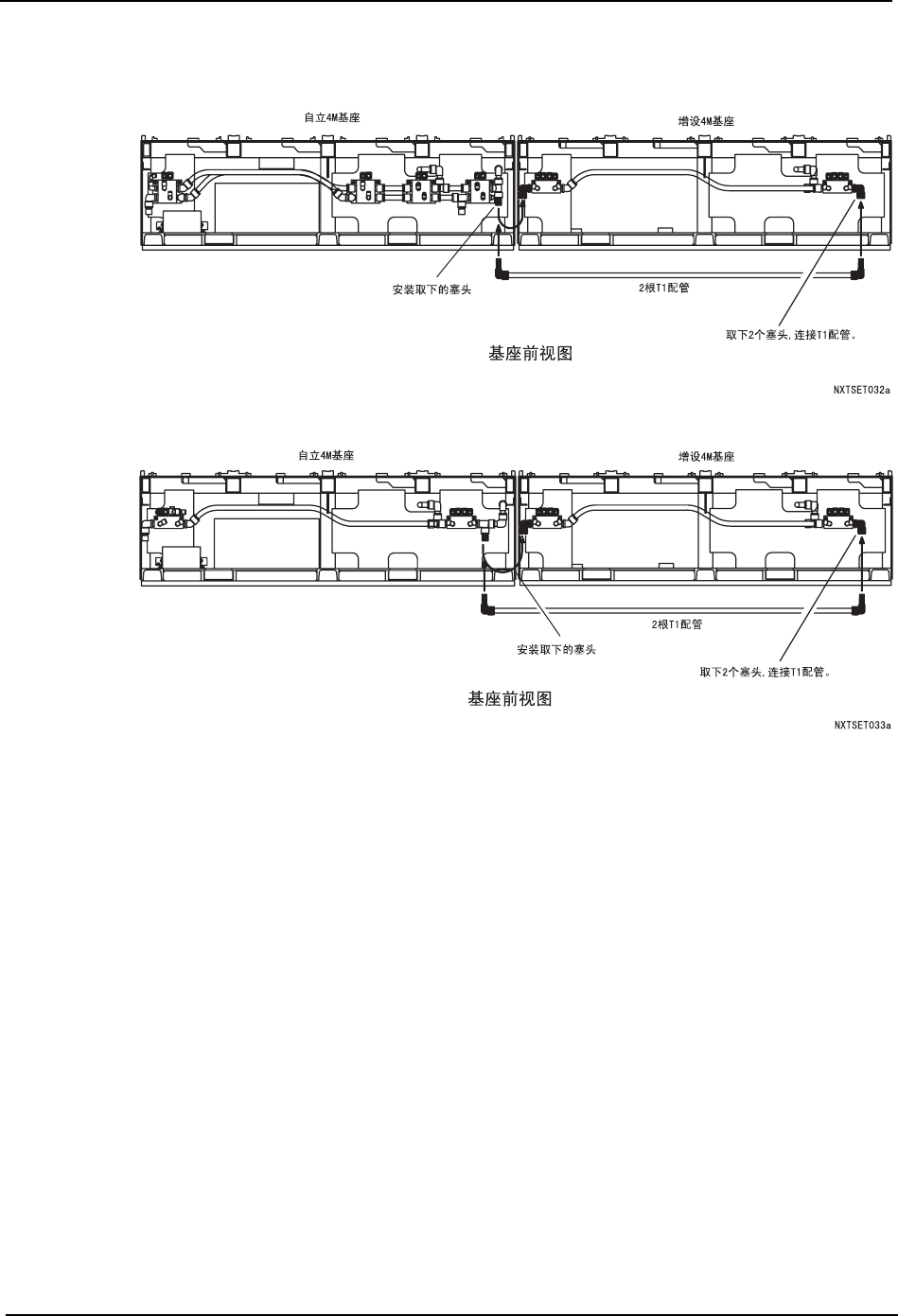QD023-07 3. 机器的安装 NXT 安装手册 99 气源配管的连接 <在序列号到 294 为止的自立 4M 基座旁增设时> <在序列号为 295 以后的自立 4M 基座旁增设时> 基座的连接 完成信号电缆的连接及气源管的 配管后, 用专用支架连接相邻基座。 请参照 [3.8.13 增设的 固定 ]。
